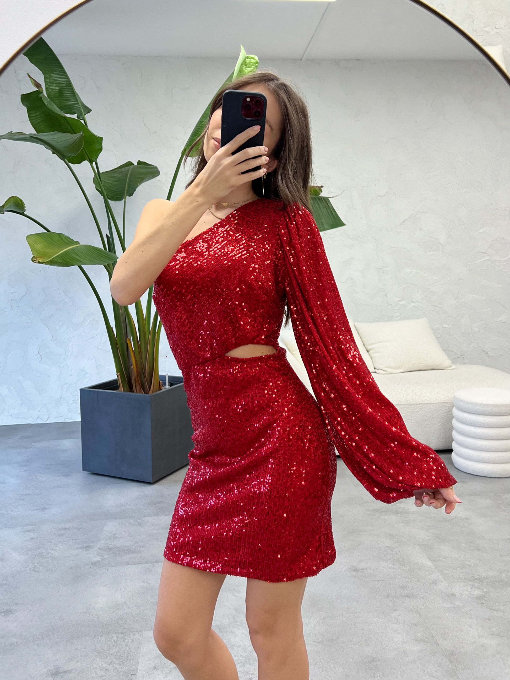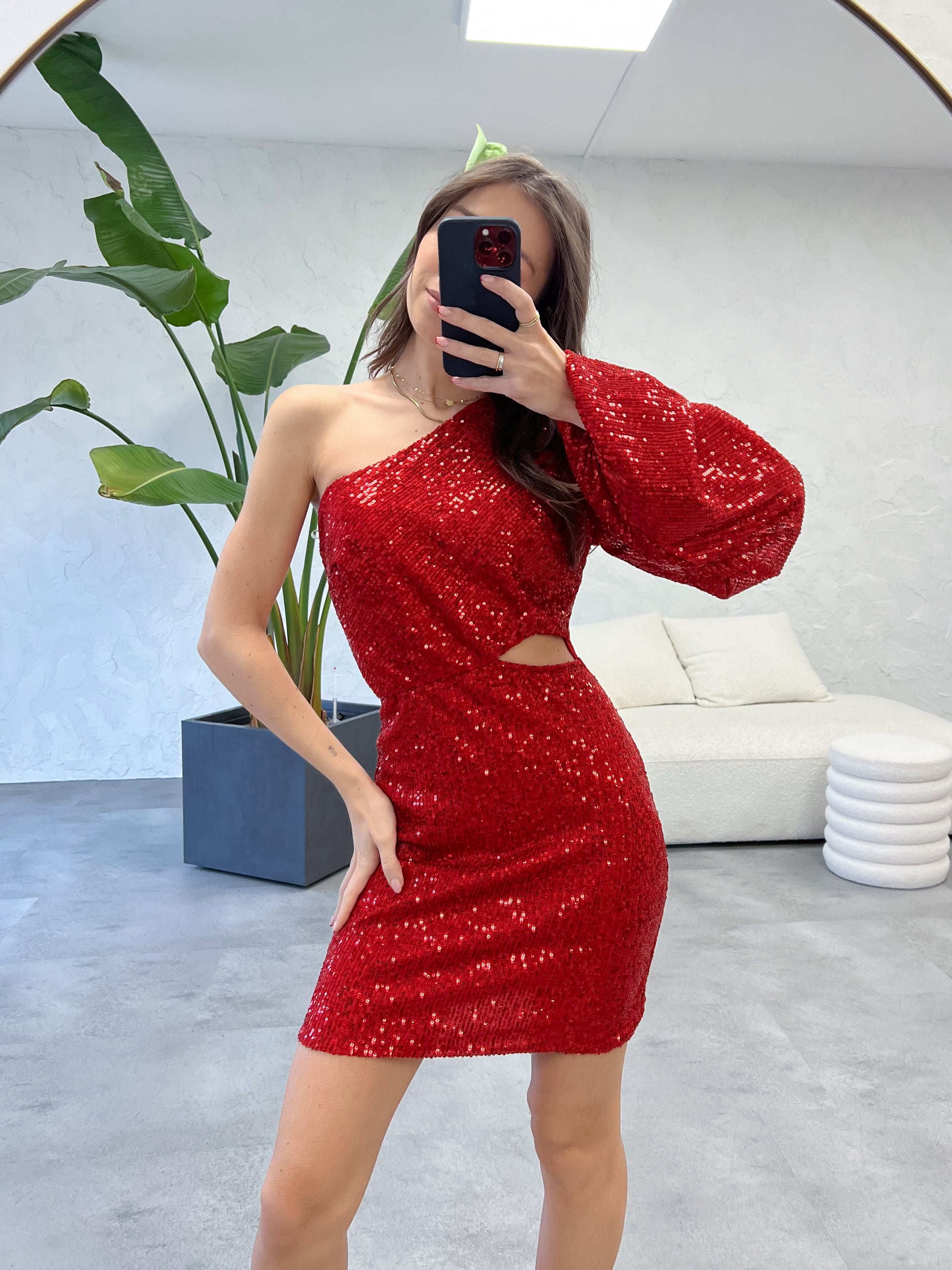 Abito rosso con paillettes, monospalla e cut out sul davanti. Taglia unica.