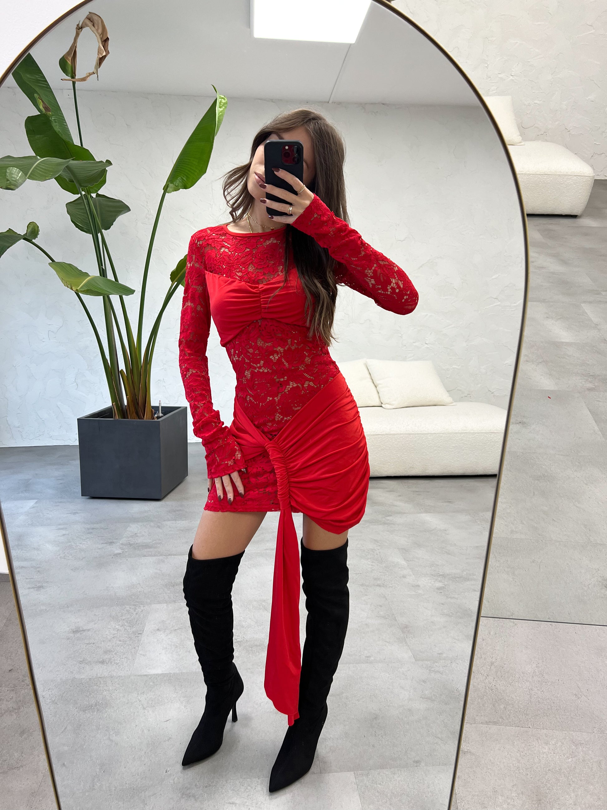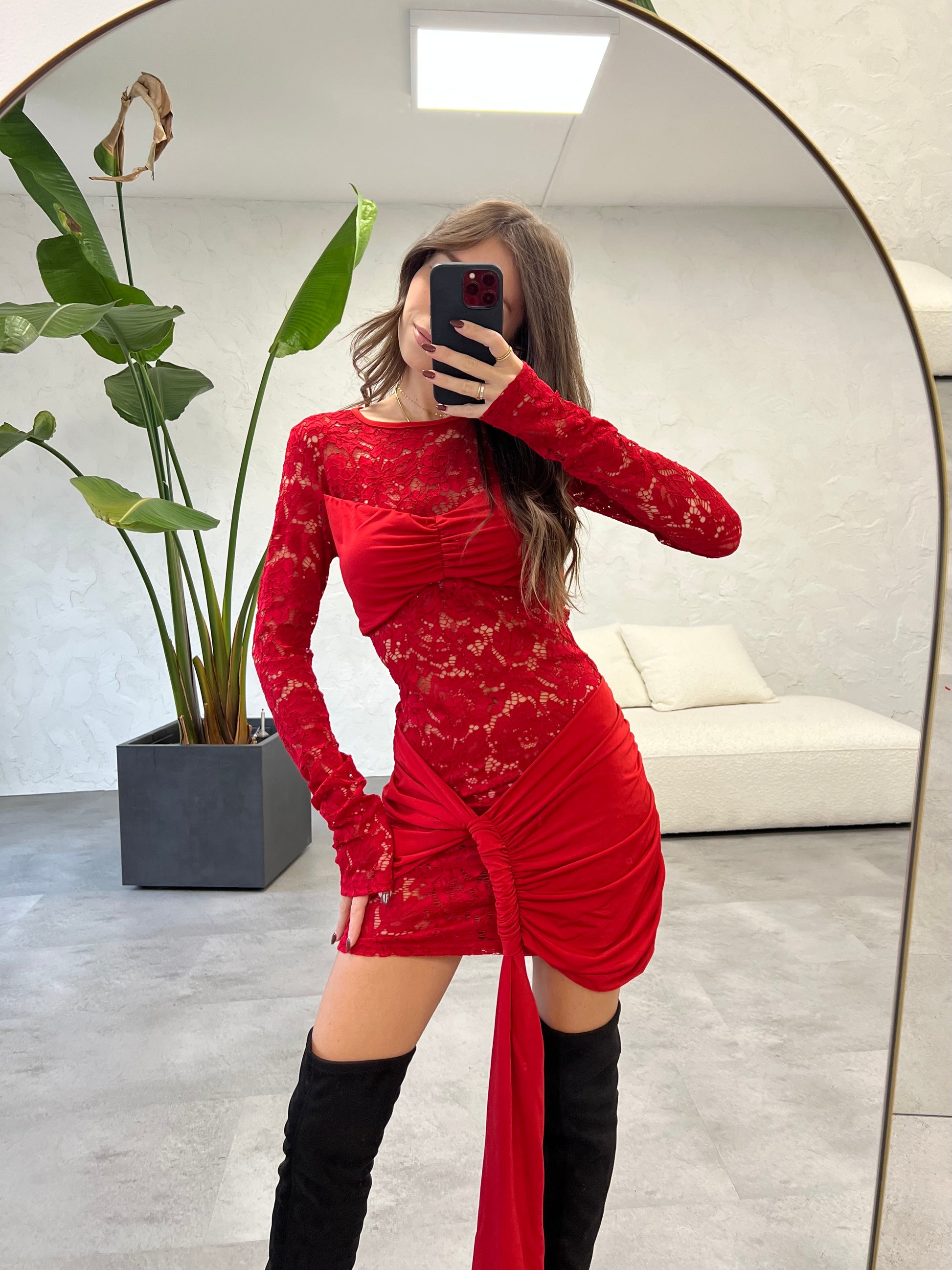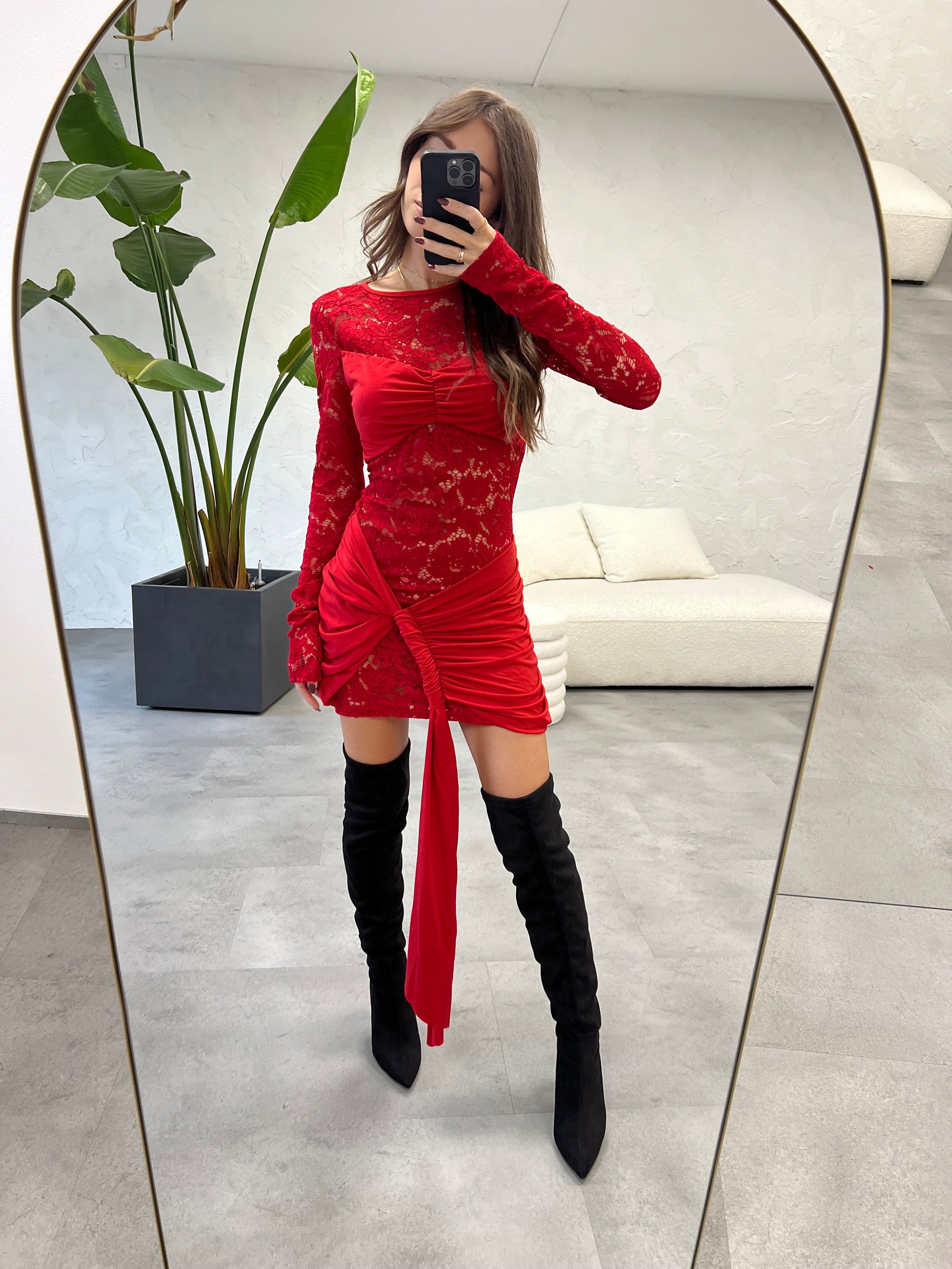 Abito in pizzo con inserti in tessuto rosso che vanno a coprire seno e parte inferiore. Taglia unica.