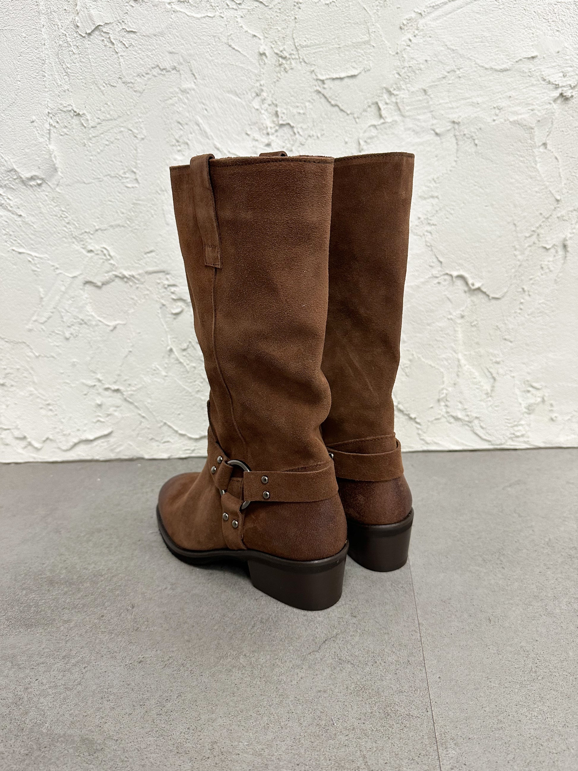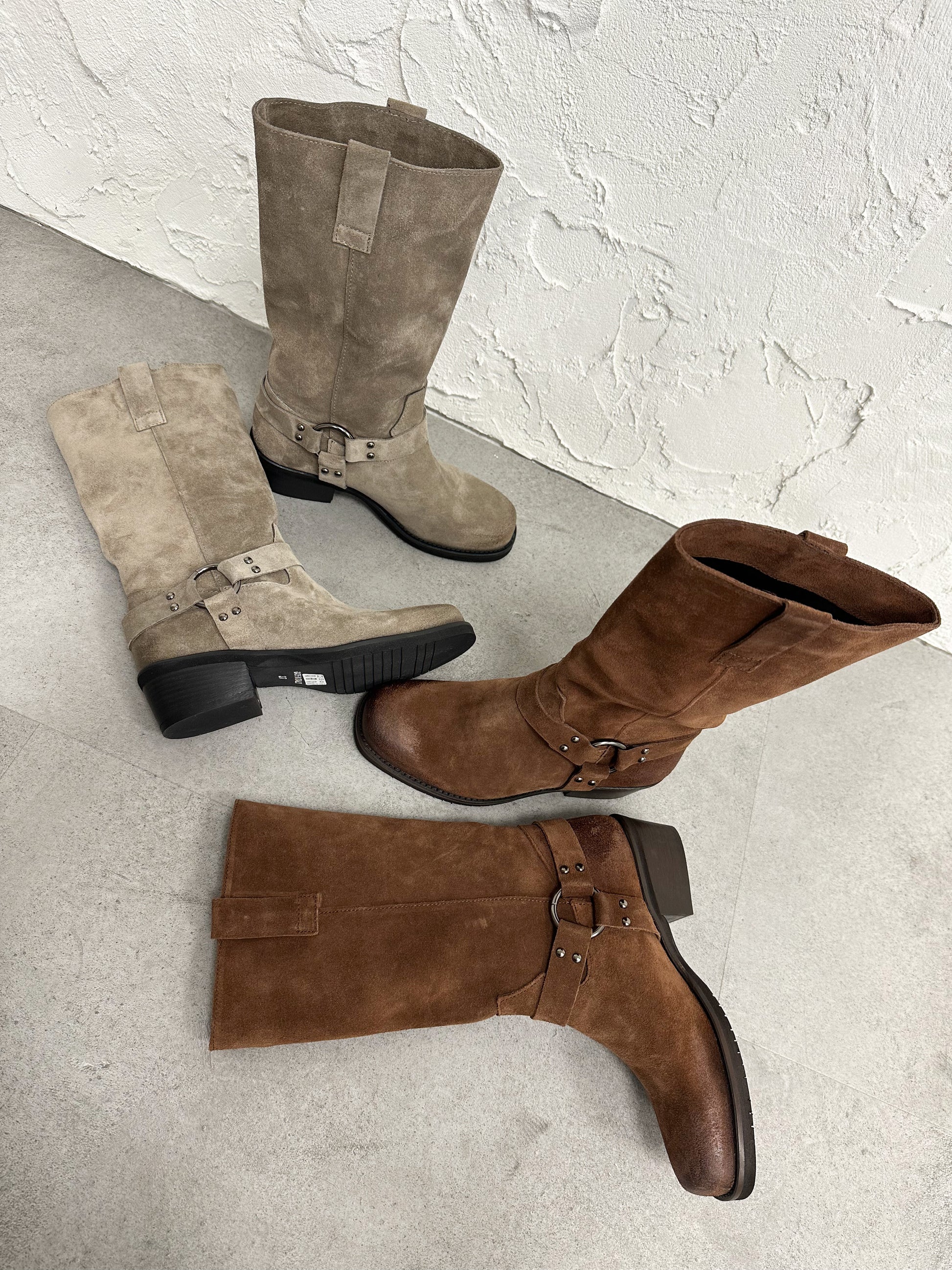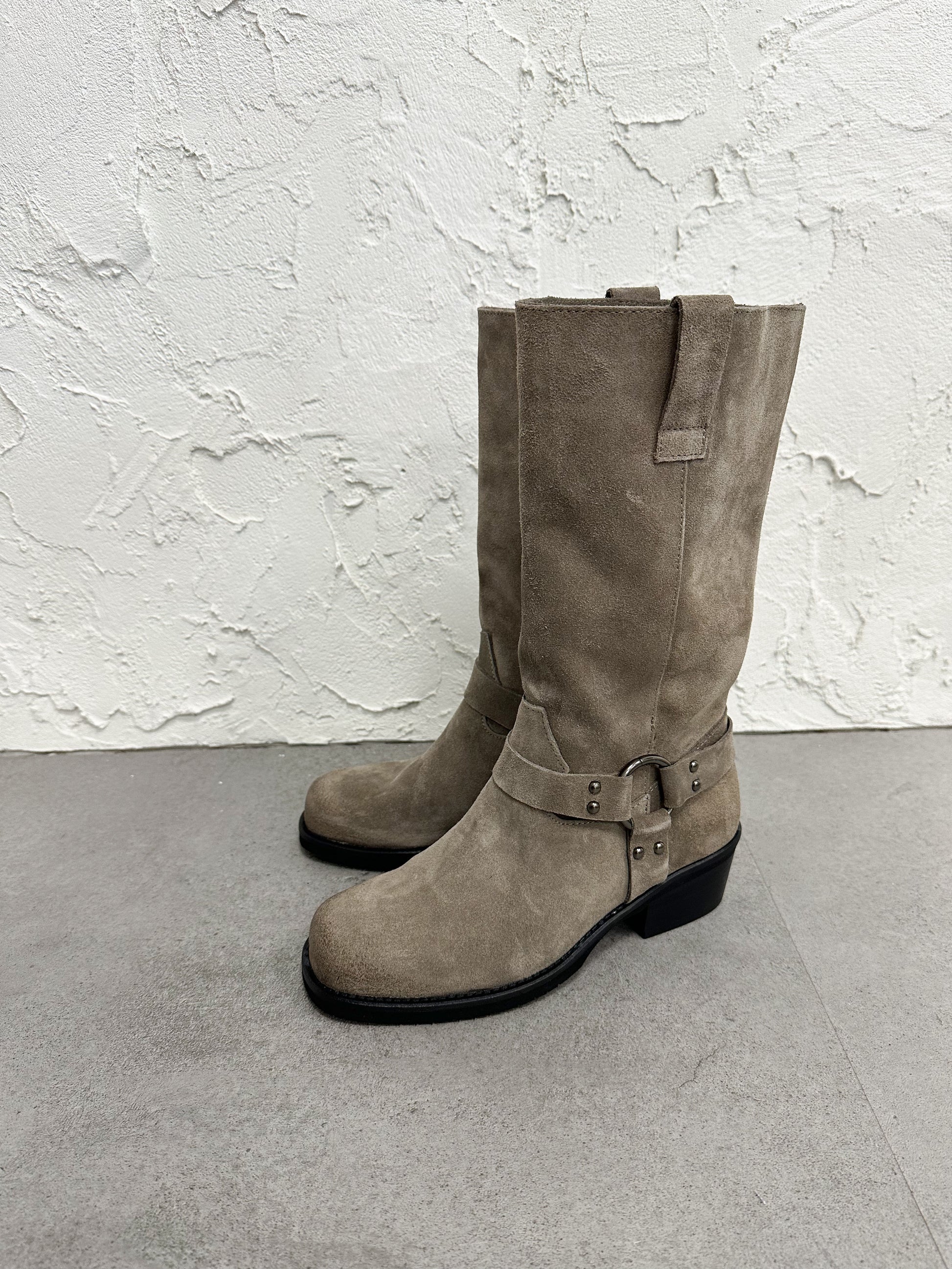 Stivale biker in vera pelle scamosciata con accessorio. Lunghezza gambale al polpaccio. Made in Italy.