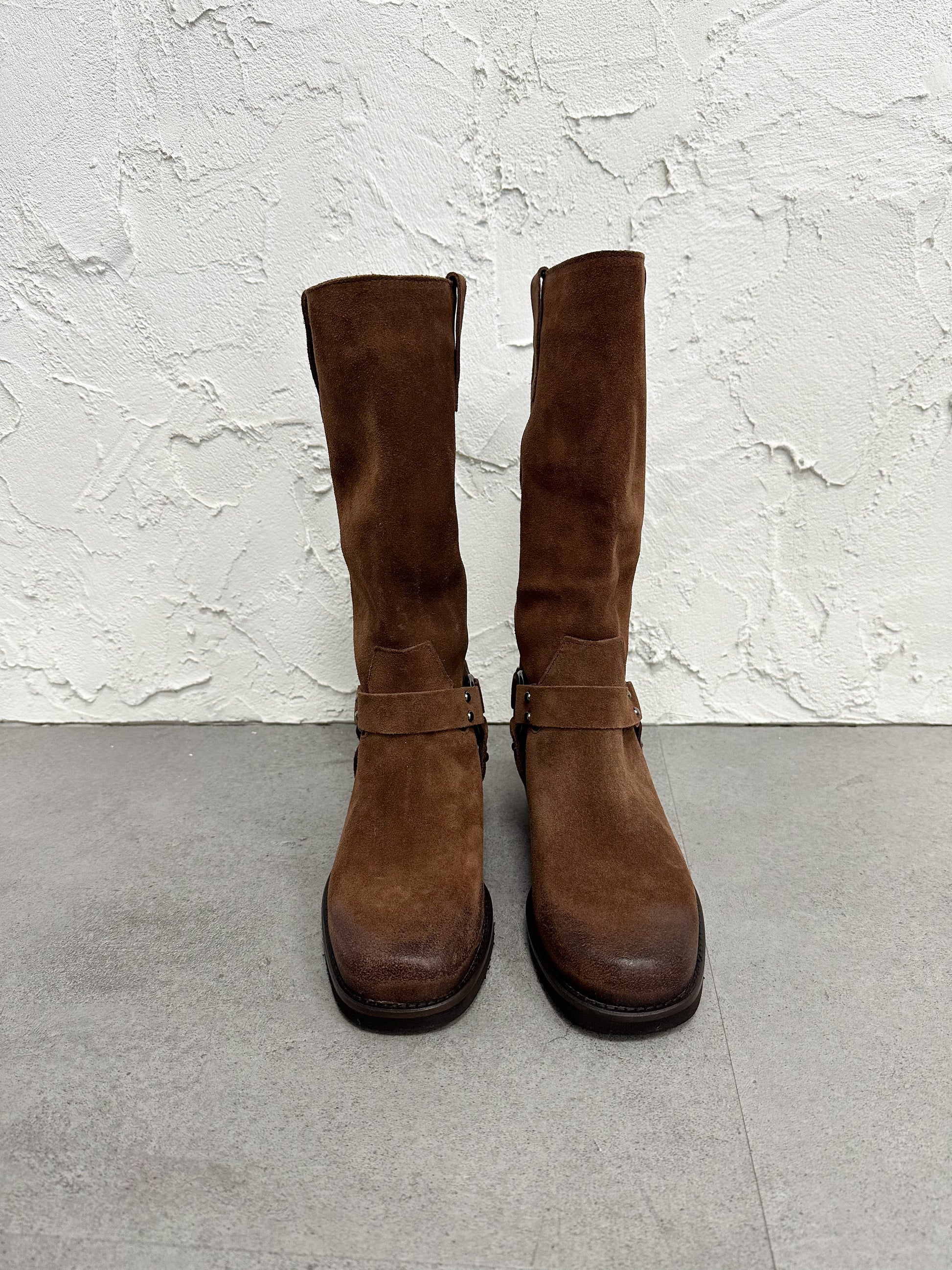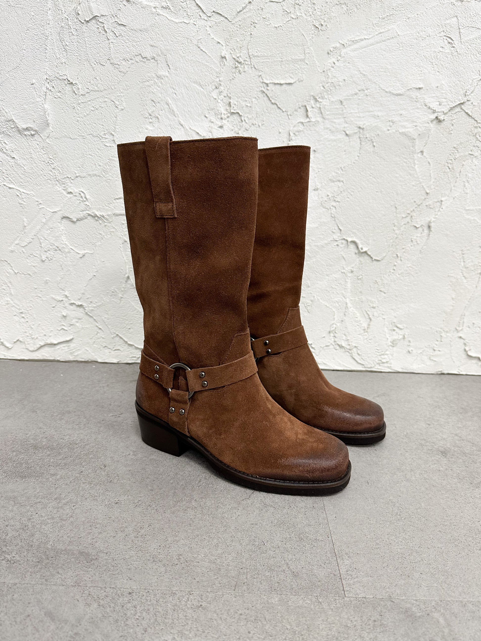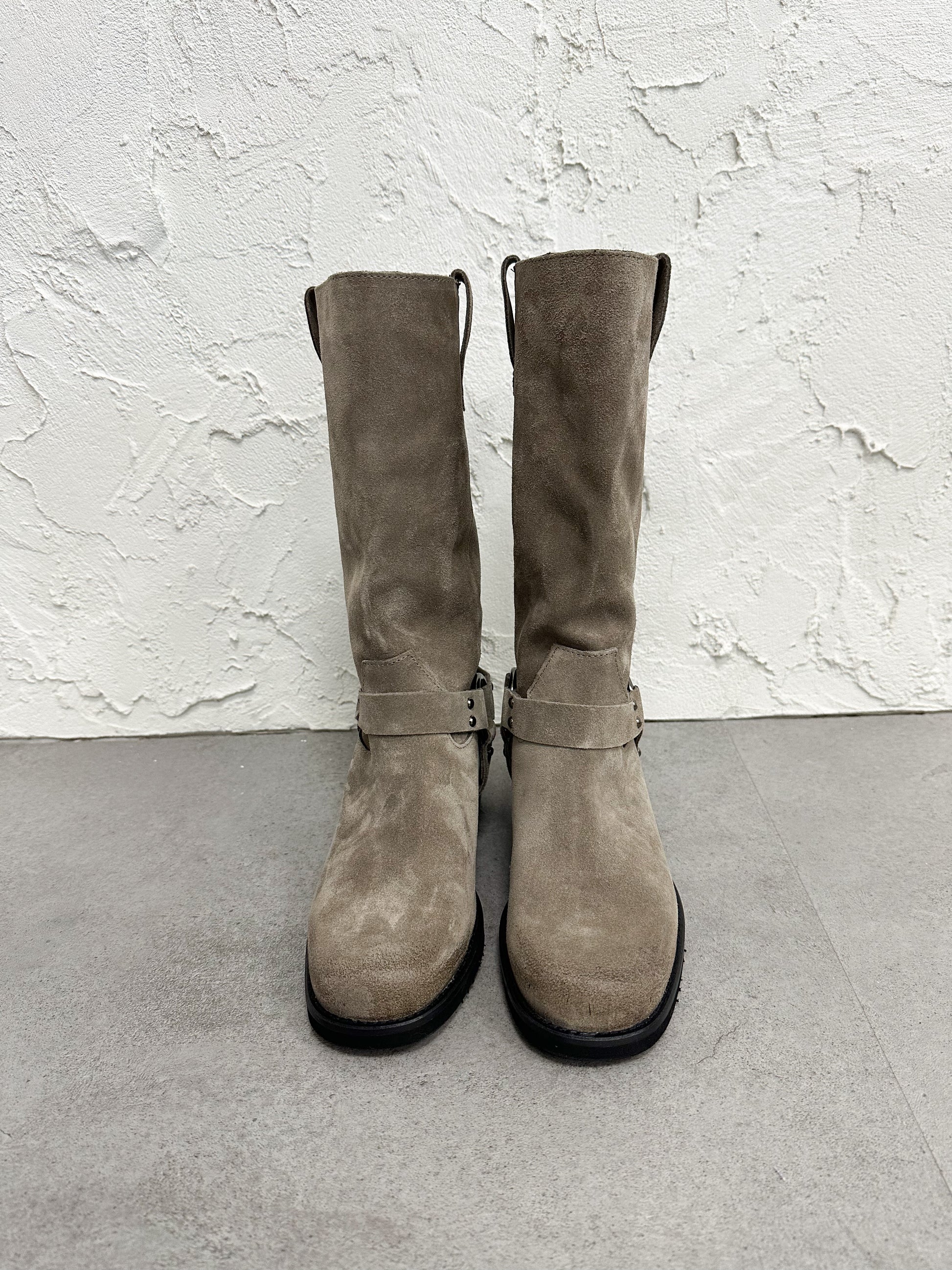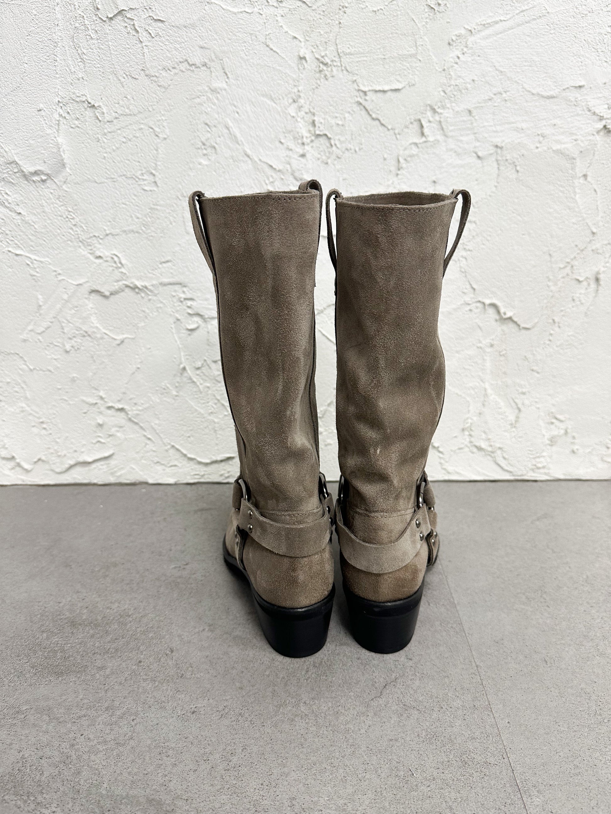 Stivale biker in vera pelle scamosciata con accessorio. Lunghezza gambale al polpaccio. Made in Italy.