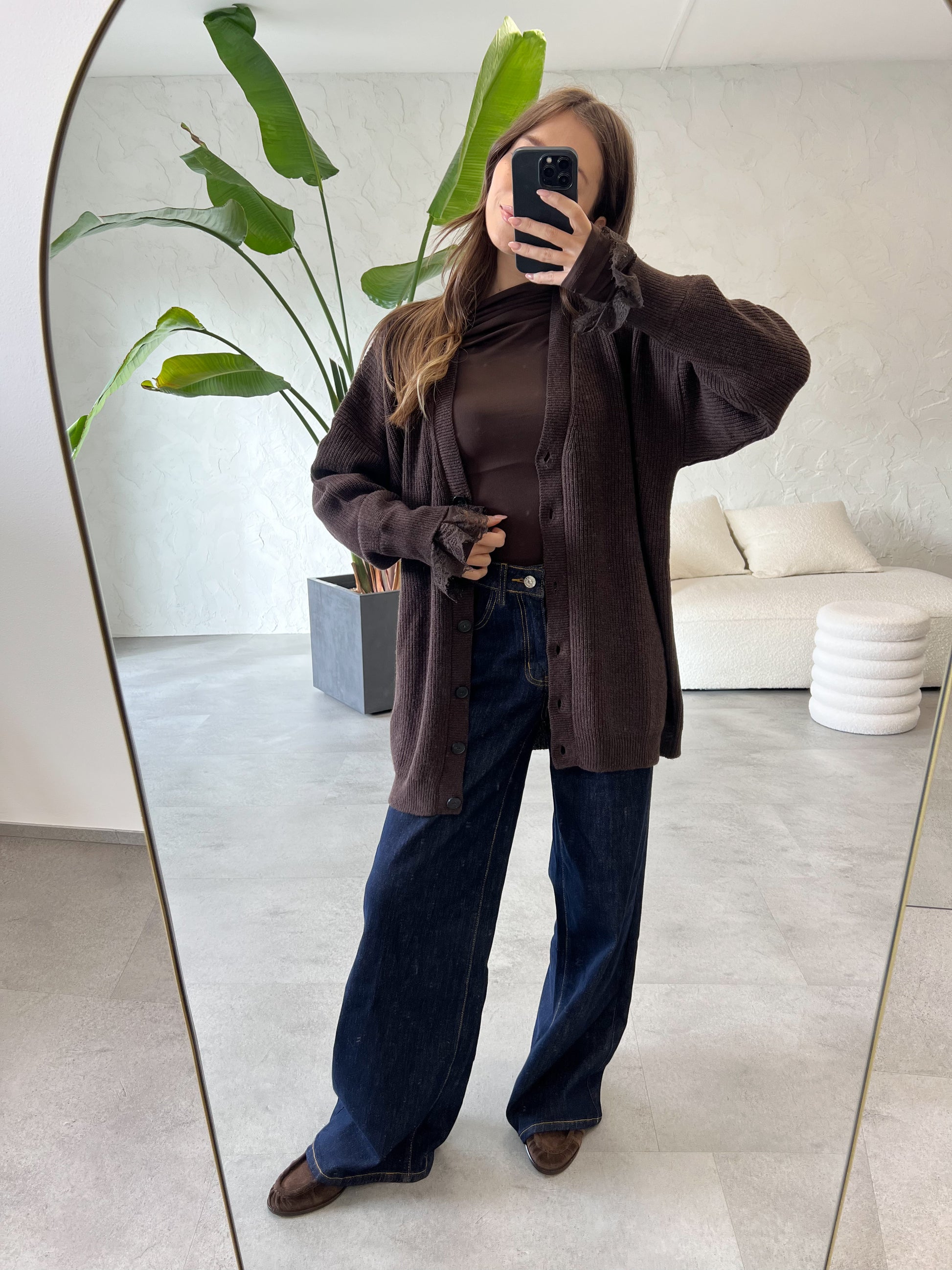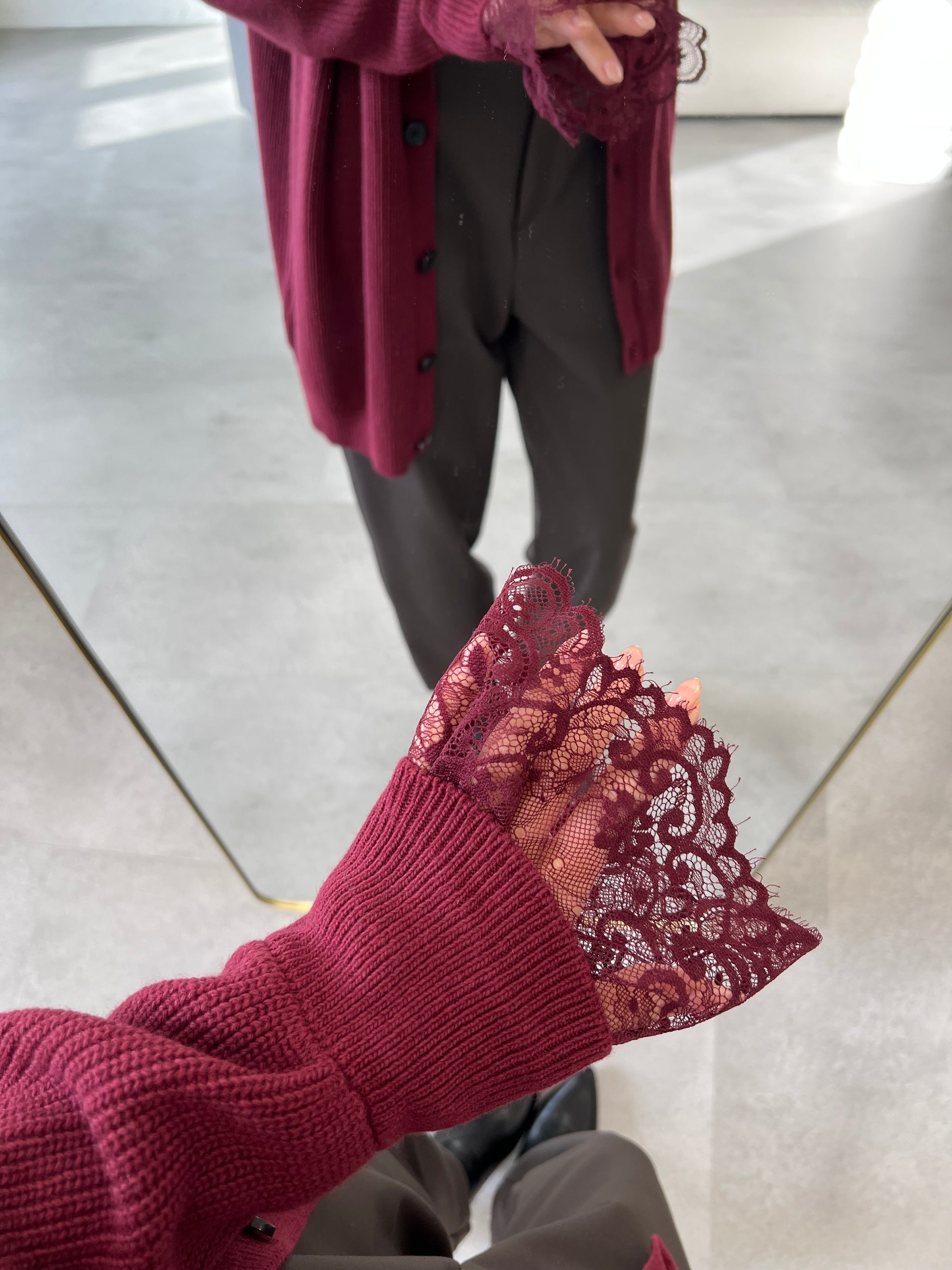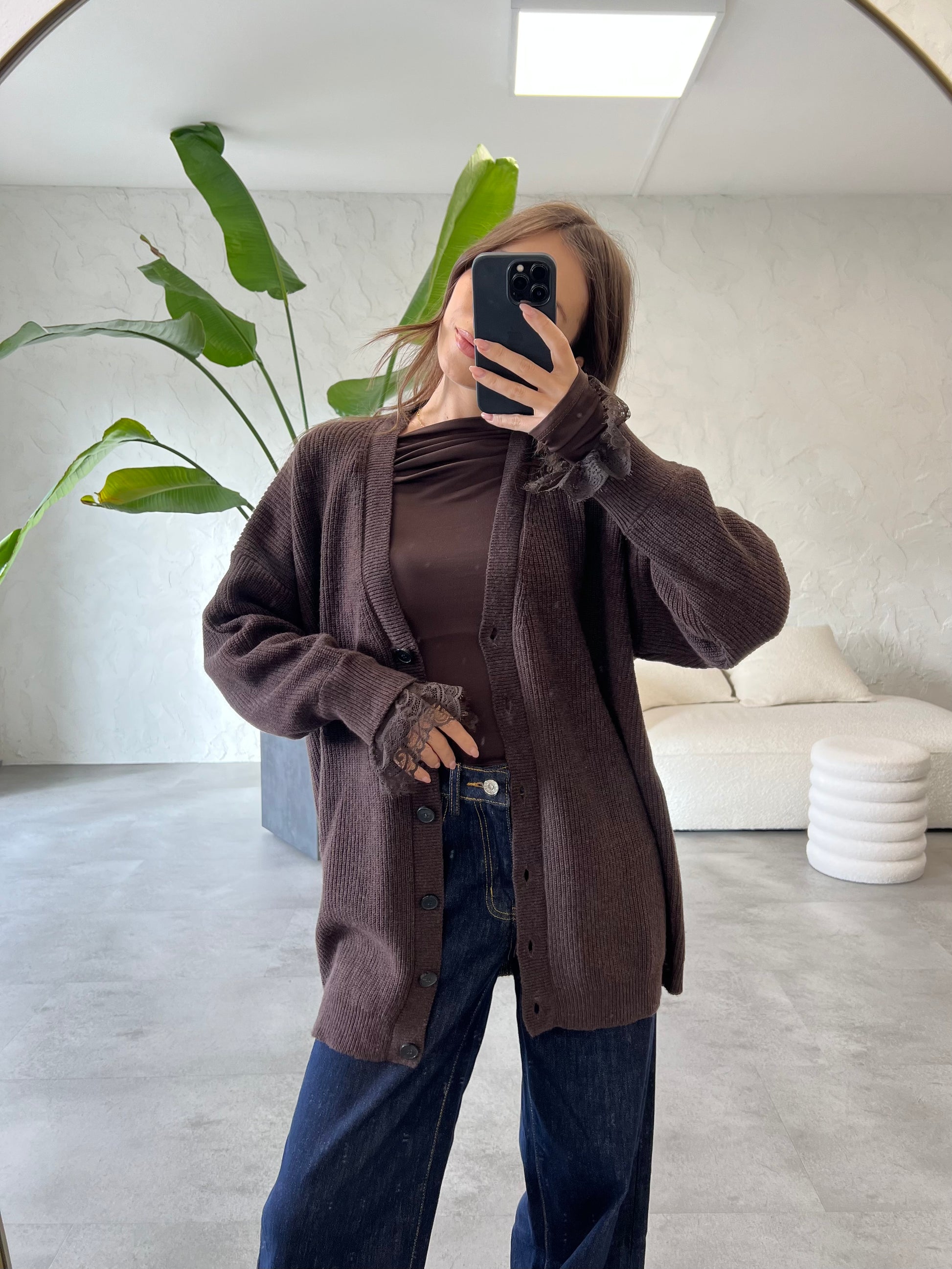 Cardigan Vicolo in maglia, media lunghezza con bottoni sul davanti e dettaglio pizzo sui polsini. Taglia unica dal fit morbido.