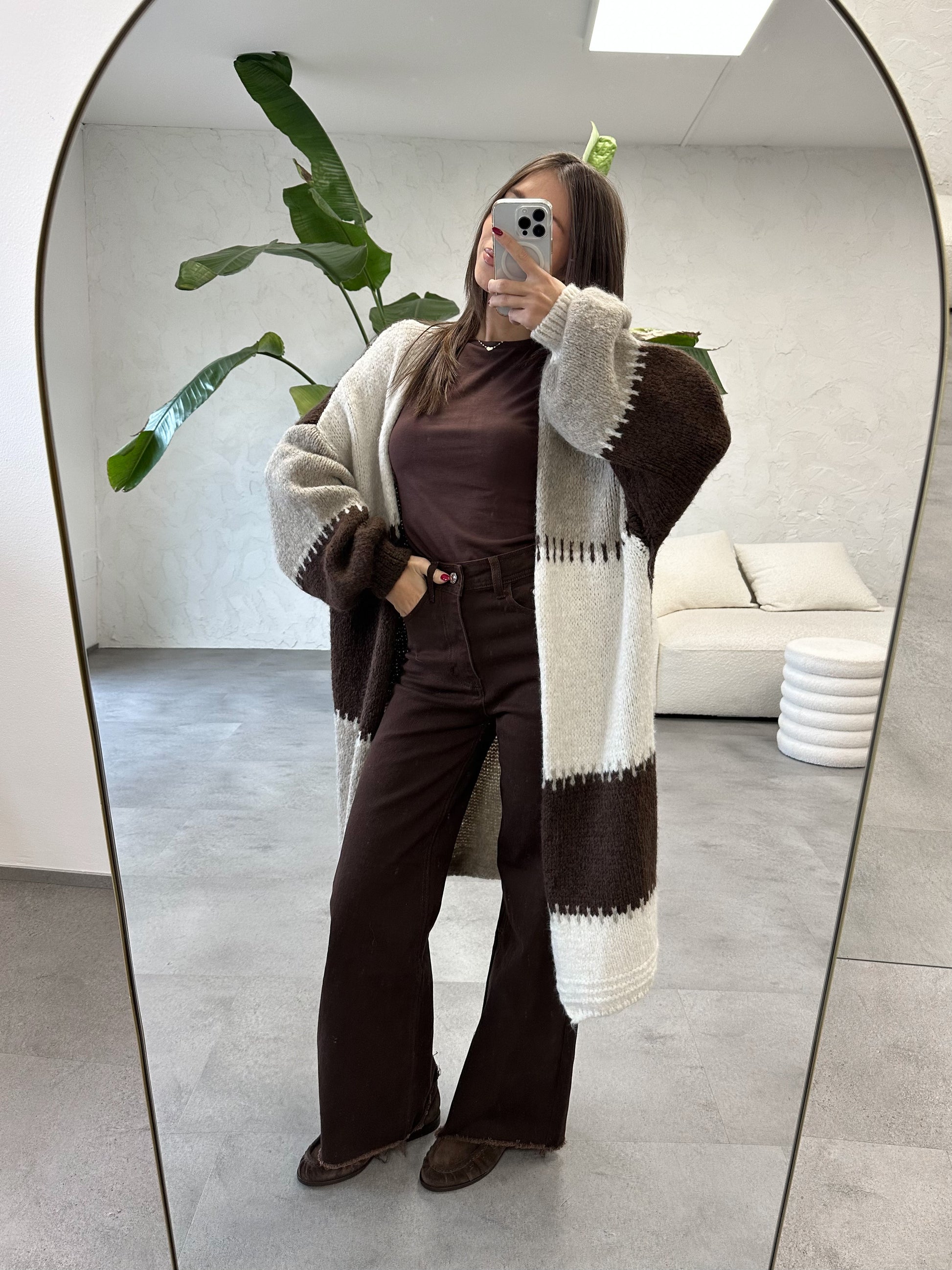 Cardigan lungo a patchwork, vestibilità morbida, taglia unica.