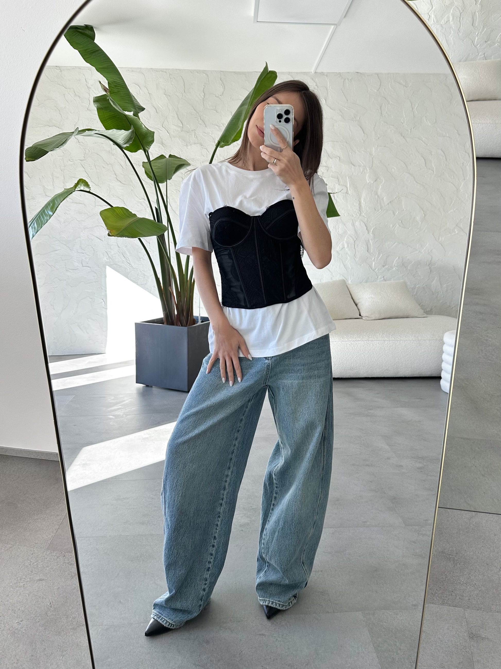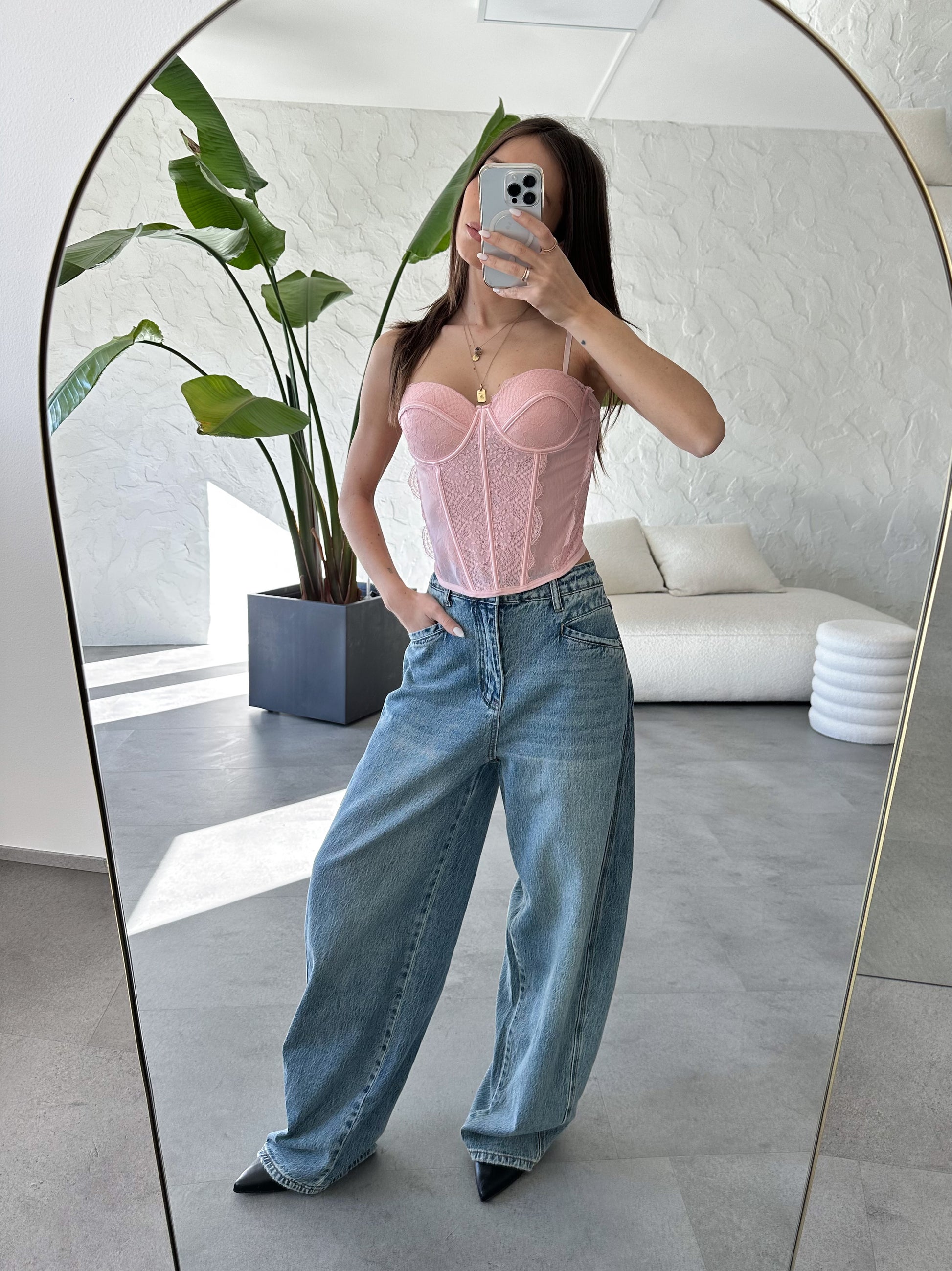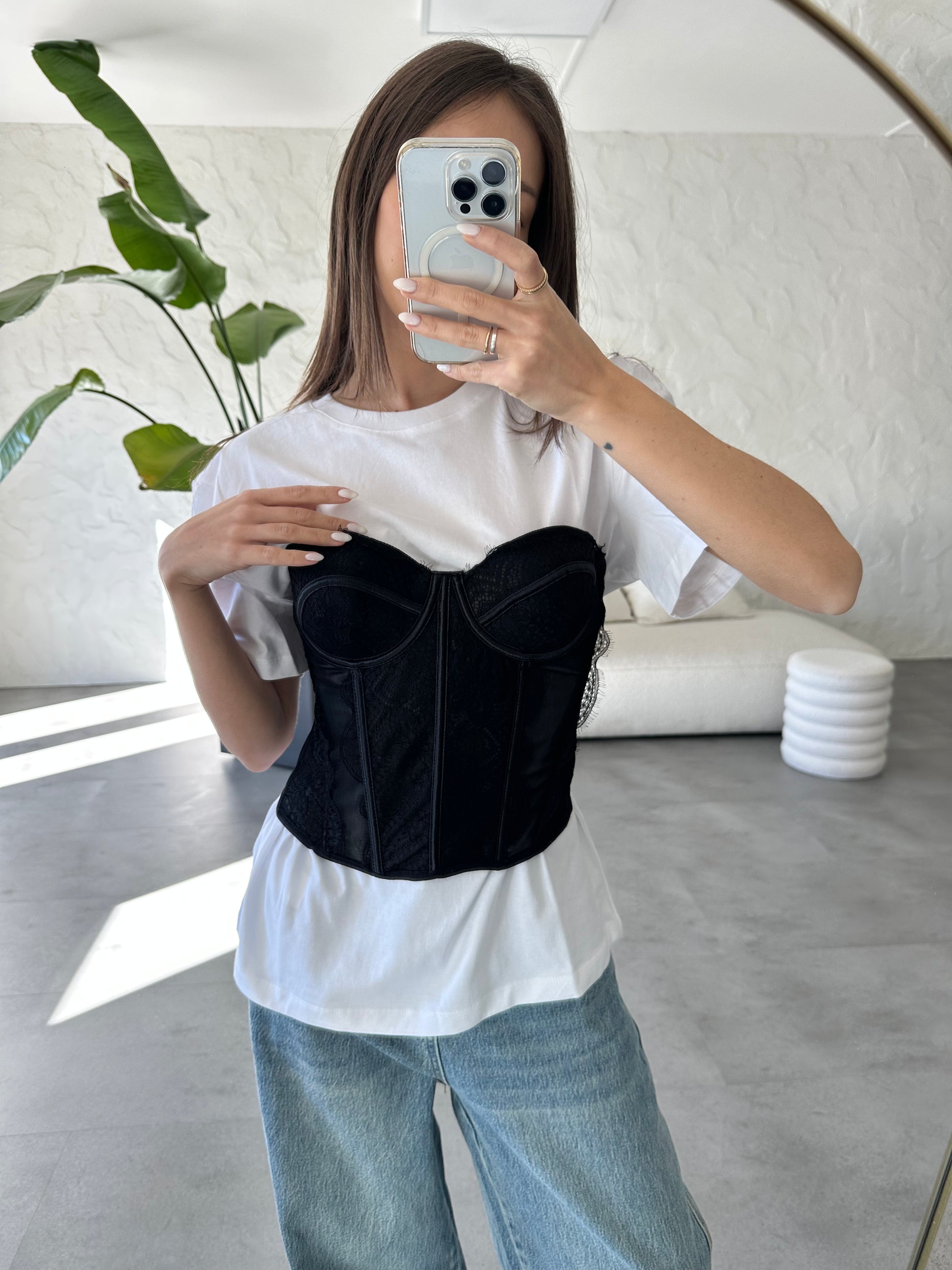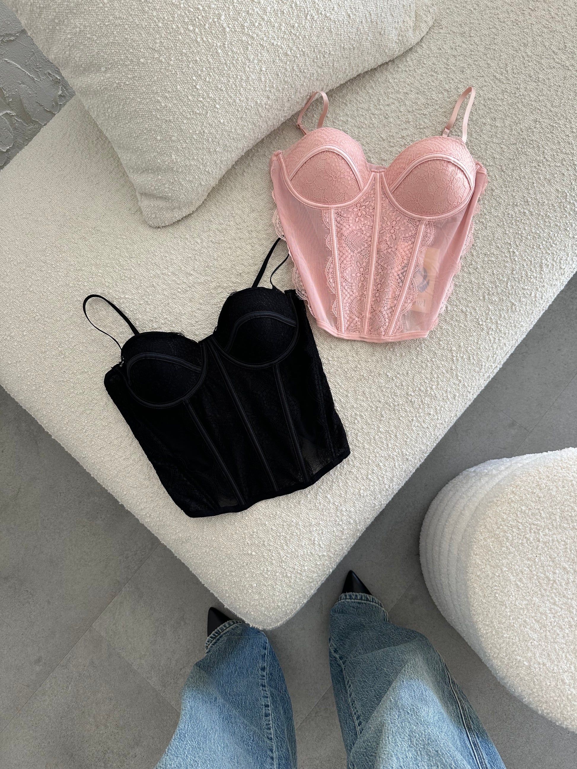 Corsetto in pizzo con ferretto e coppe imbottite. Chiusura posteriore con gancetti e spalline regolabili. Taglia unica.