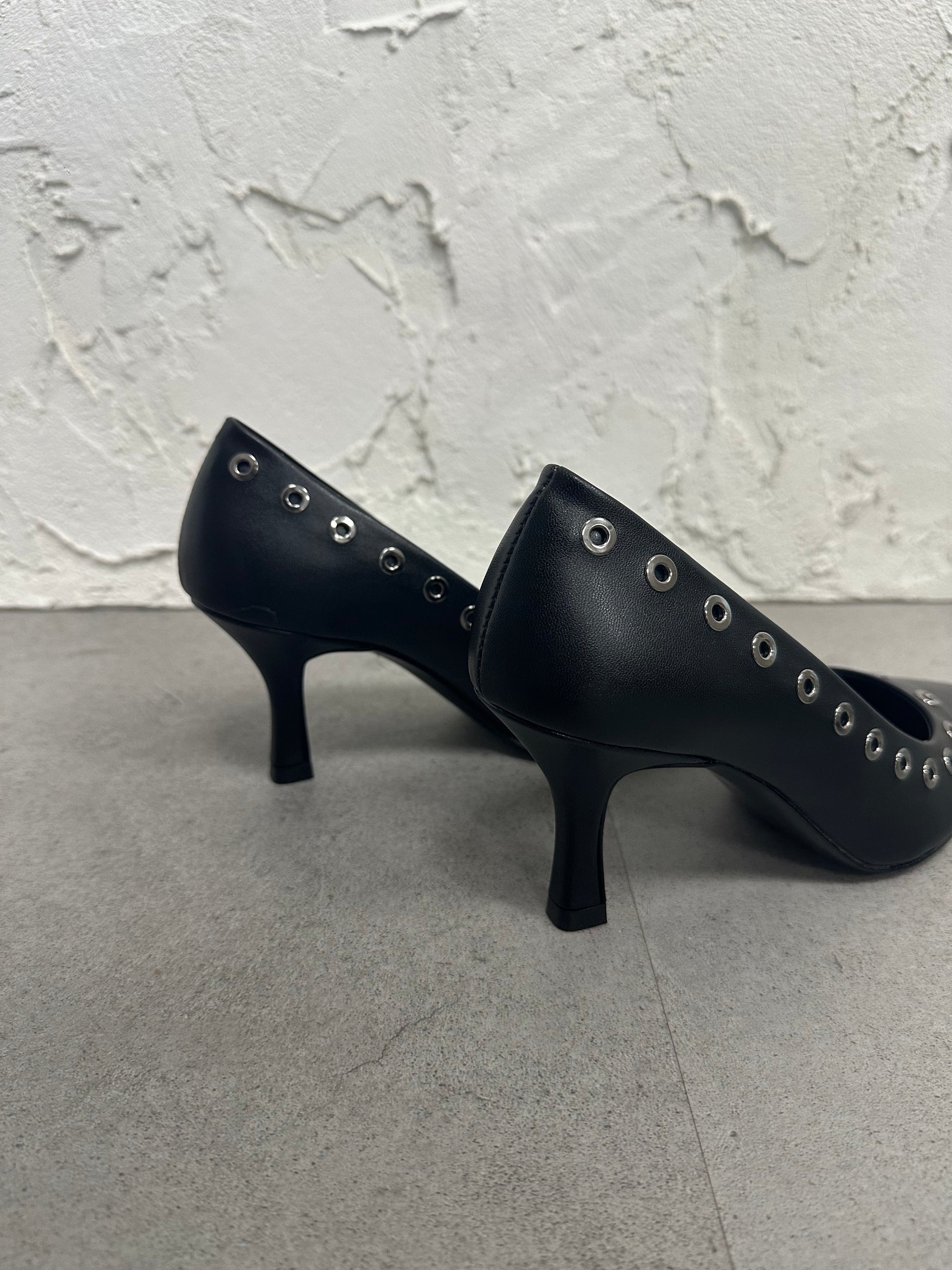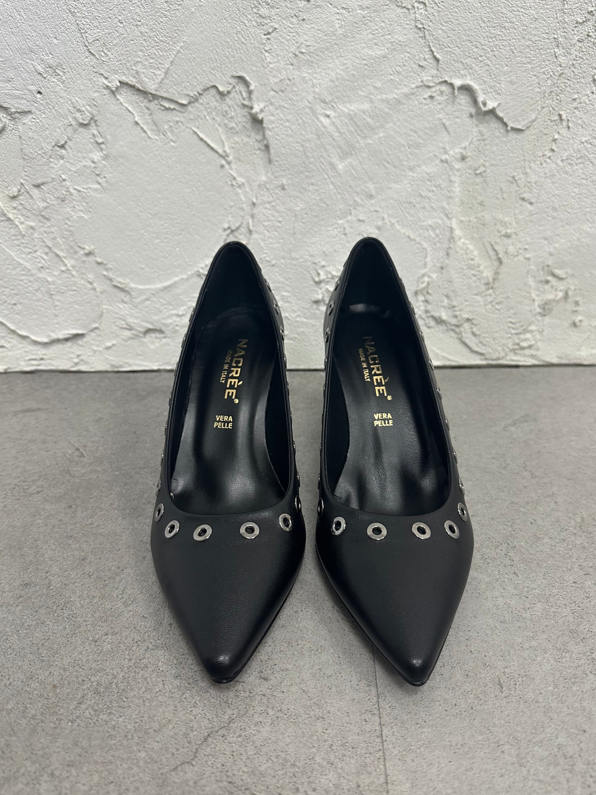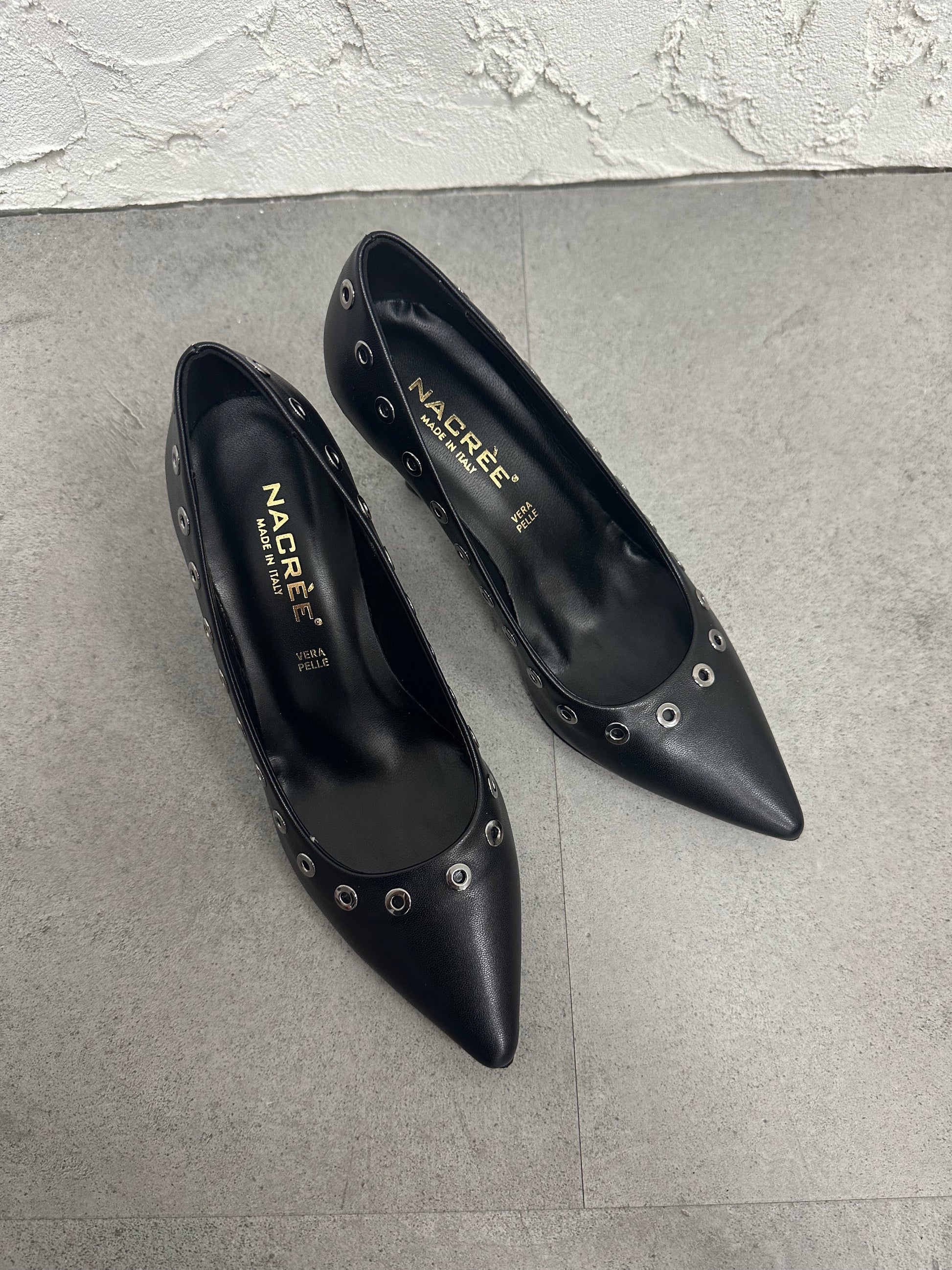 Dècolletè Nacrèe nero in similpelle con inserti di borchie, per un look grintoso e alla moda. Suoletta in vera pelle, altezza tacco 7 cm.