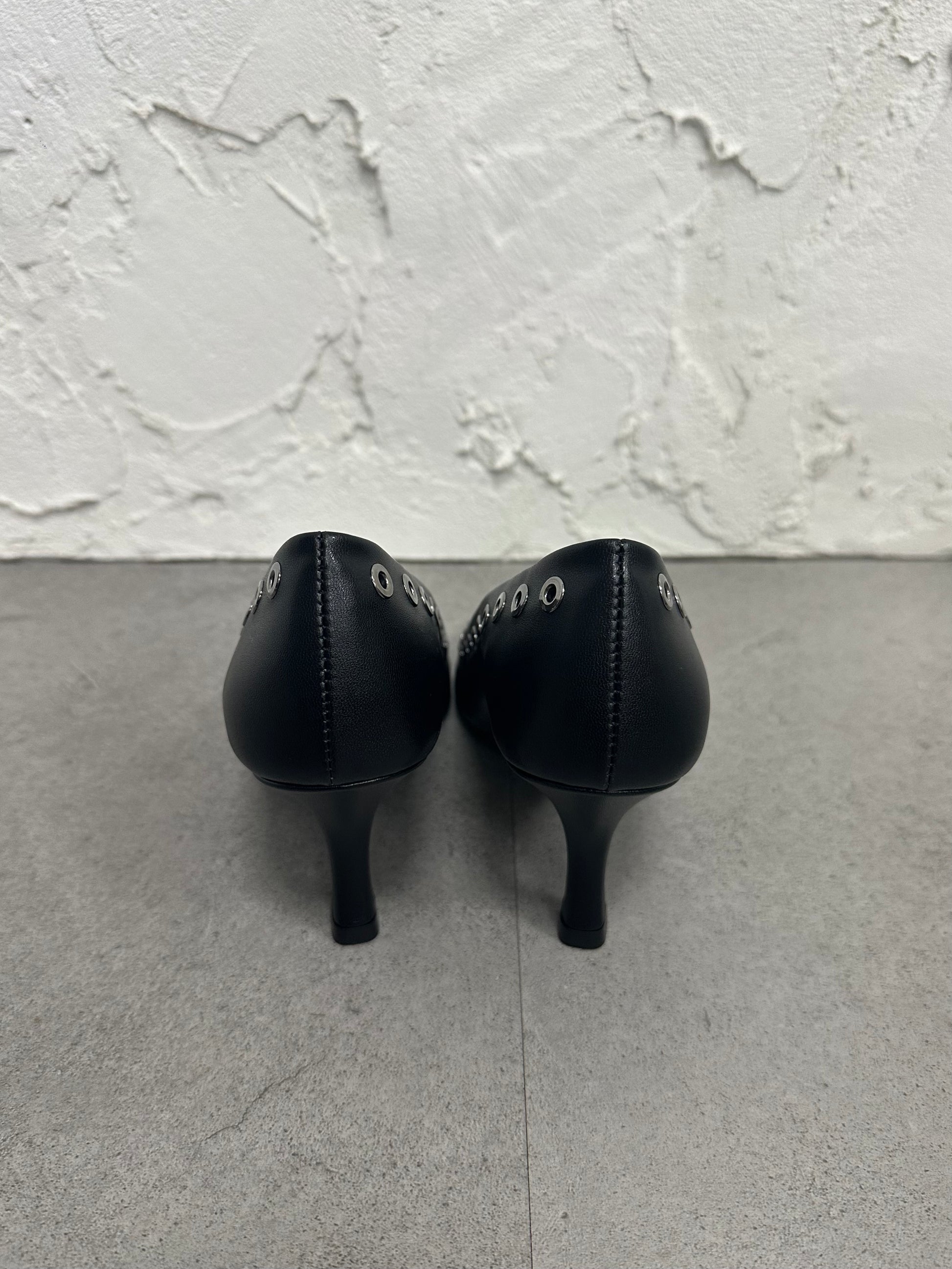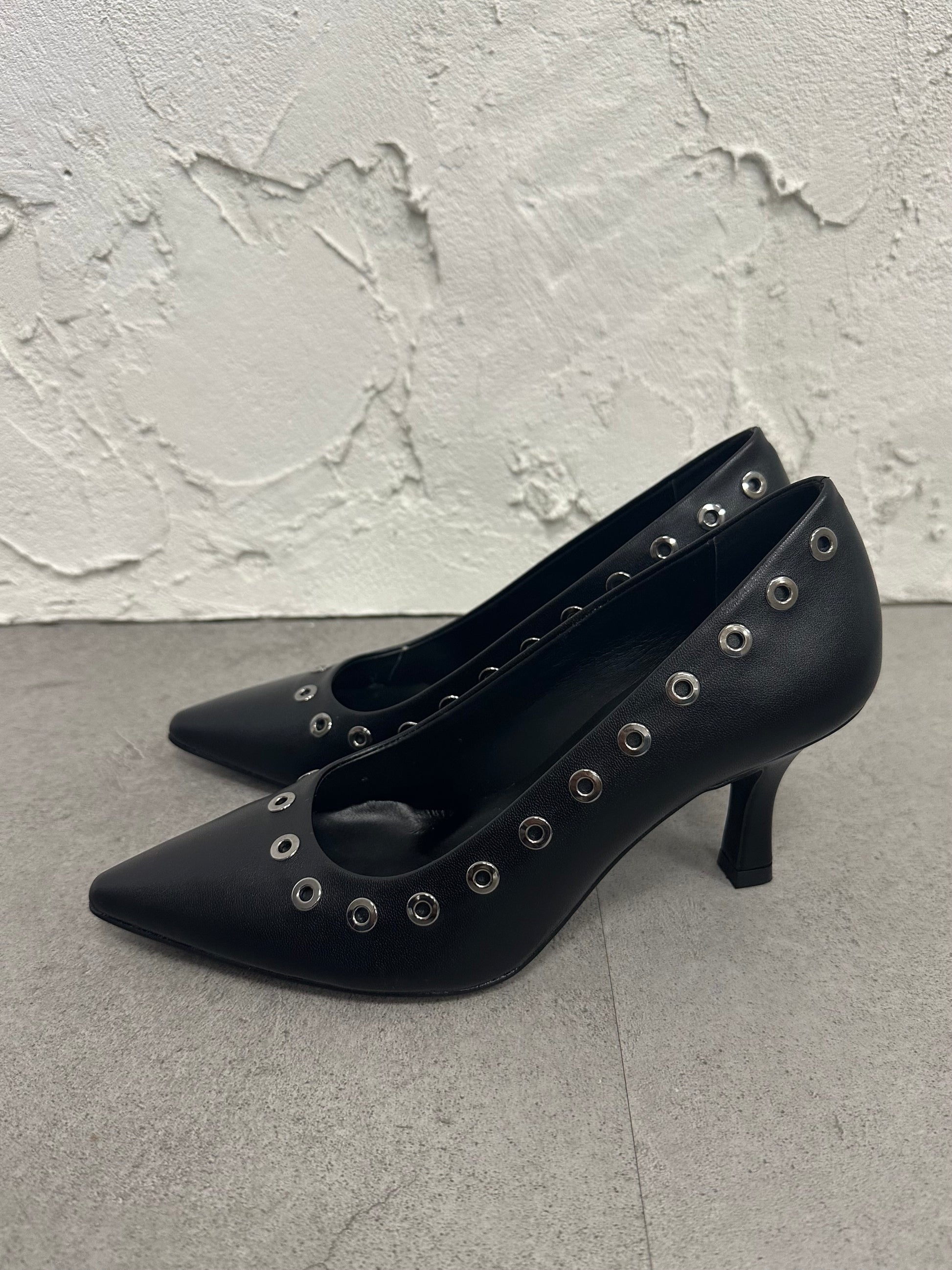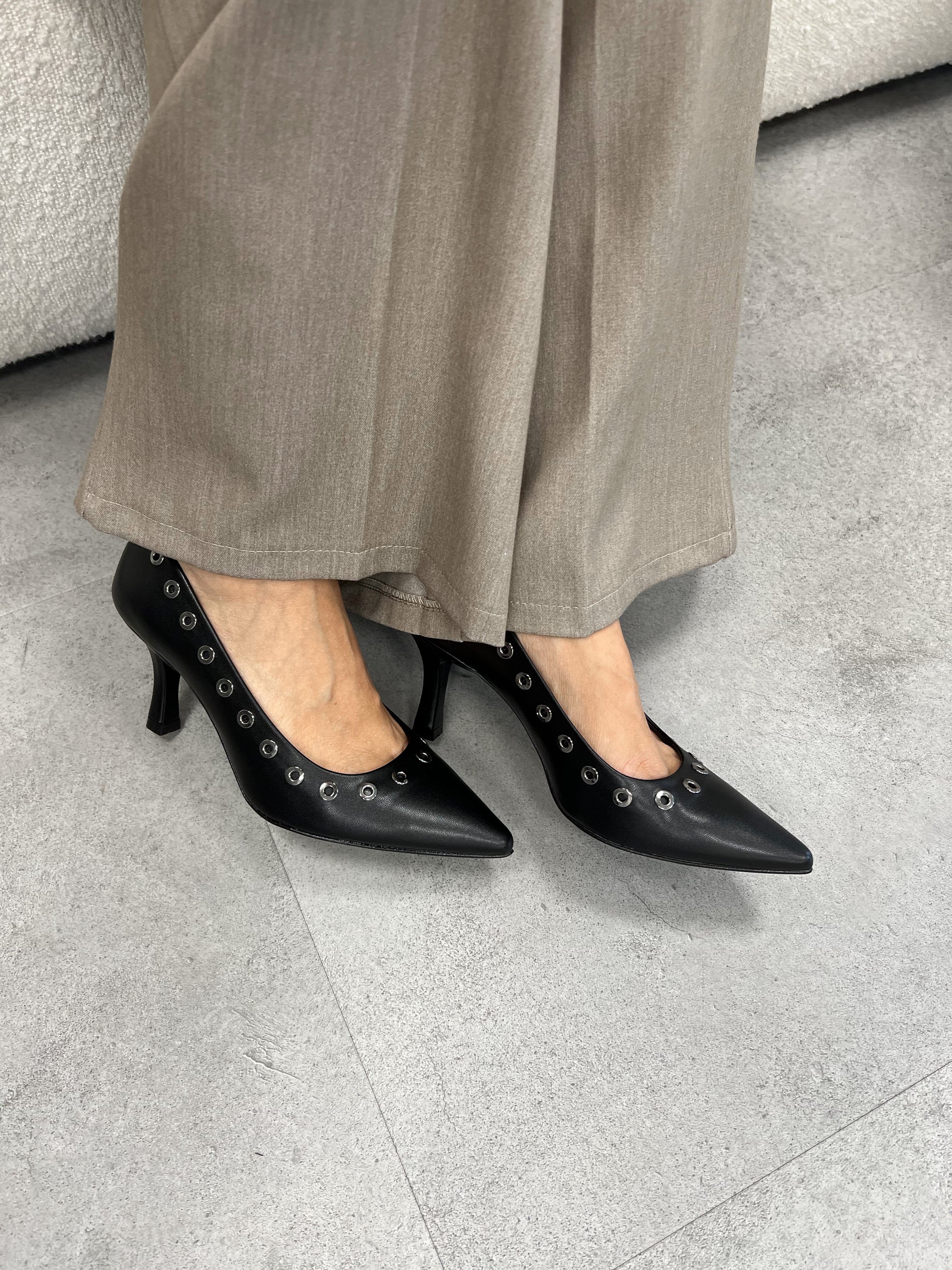 Dècolletè Nacrèe nero in similpelle con inserti di borchie, per un look grintoso e alla moda. Suoletta in vera pelle, altezza tacco 7 cm.