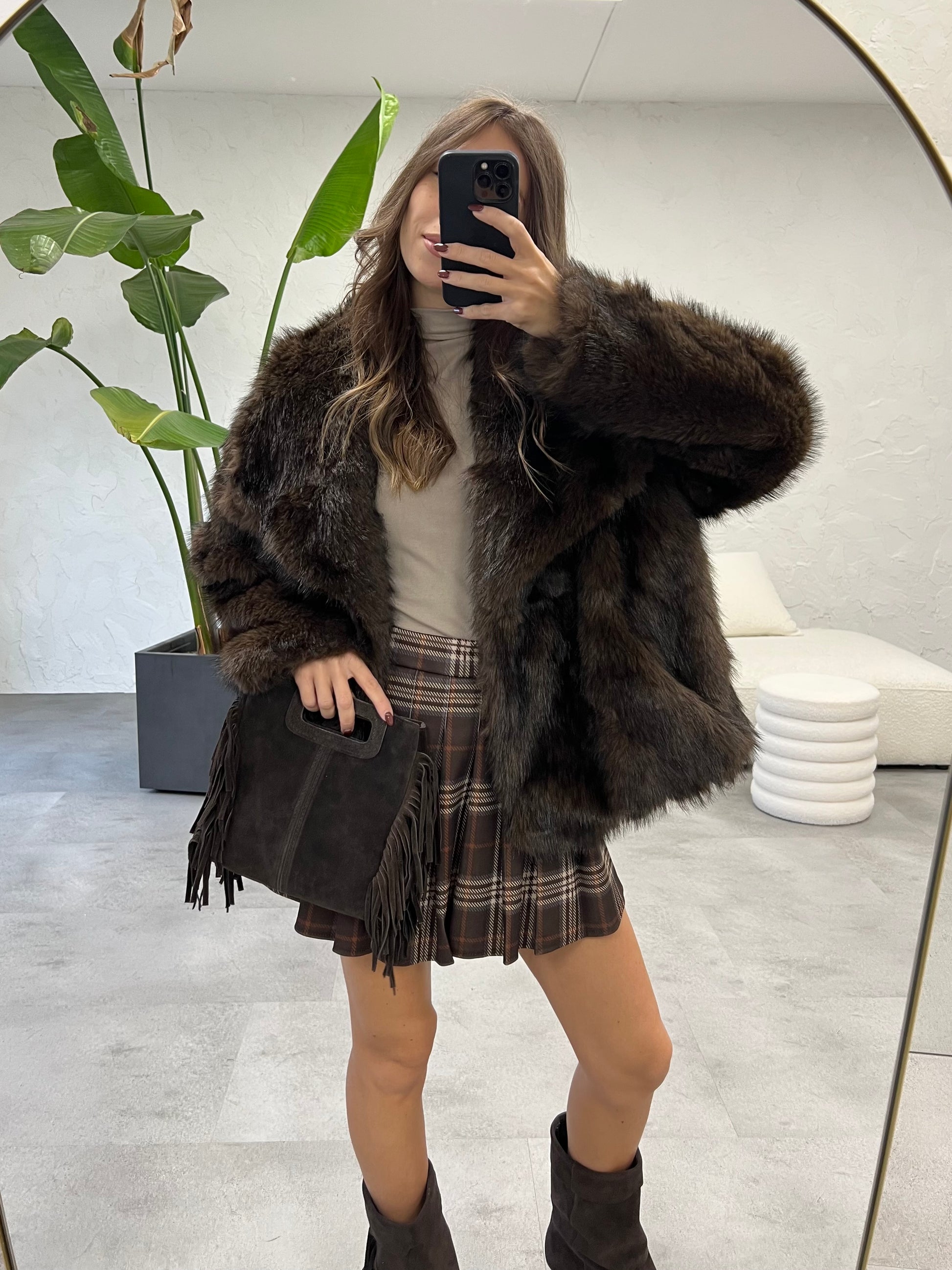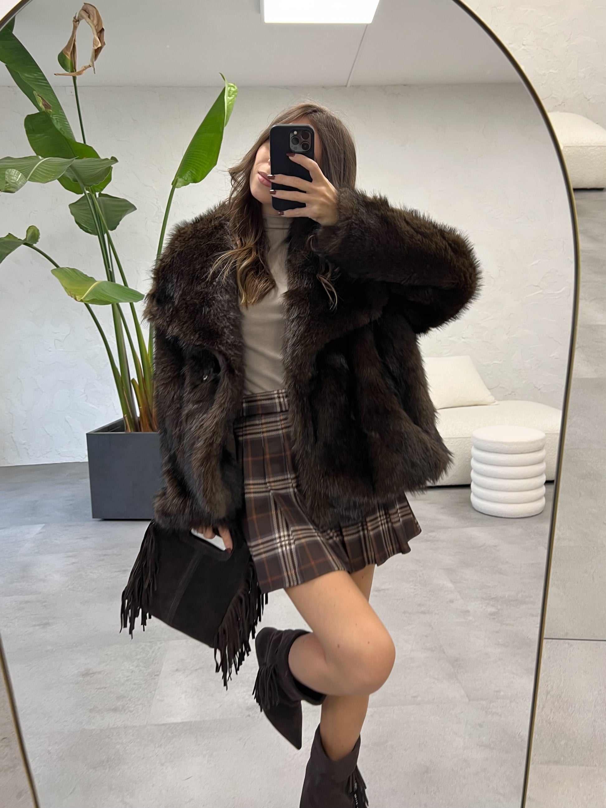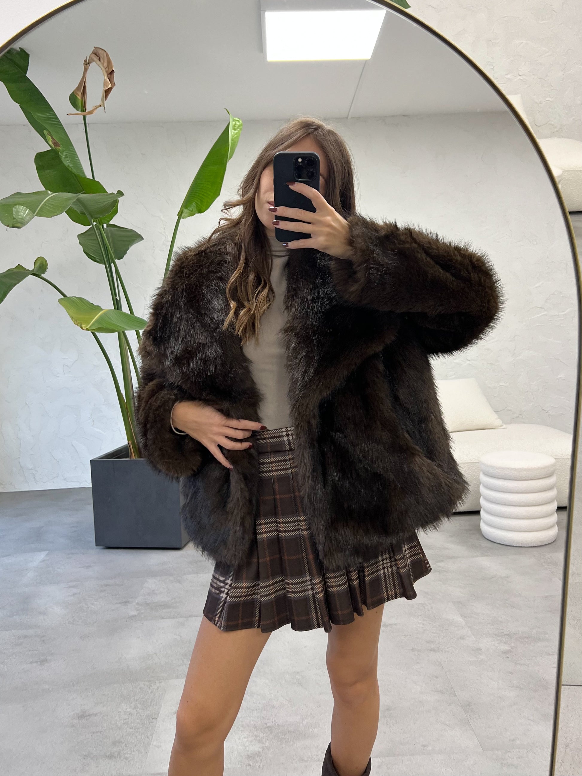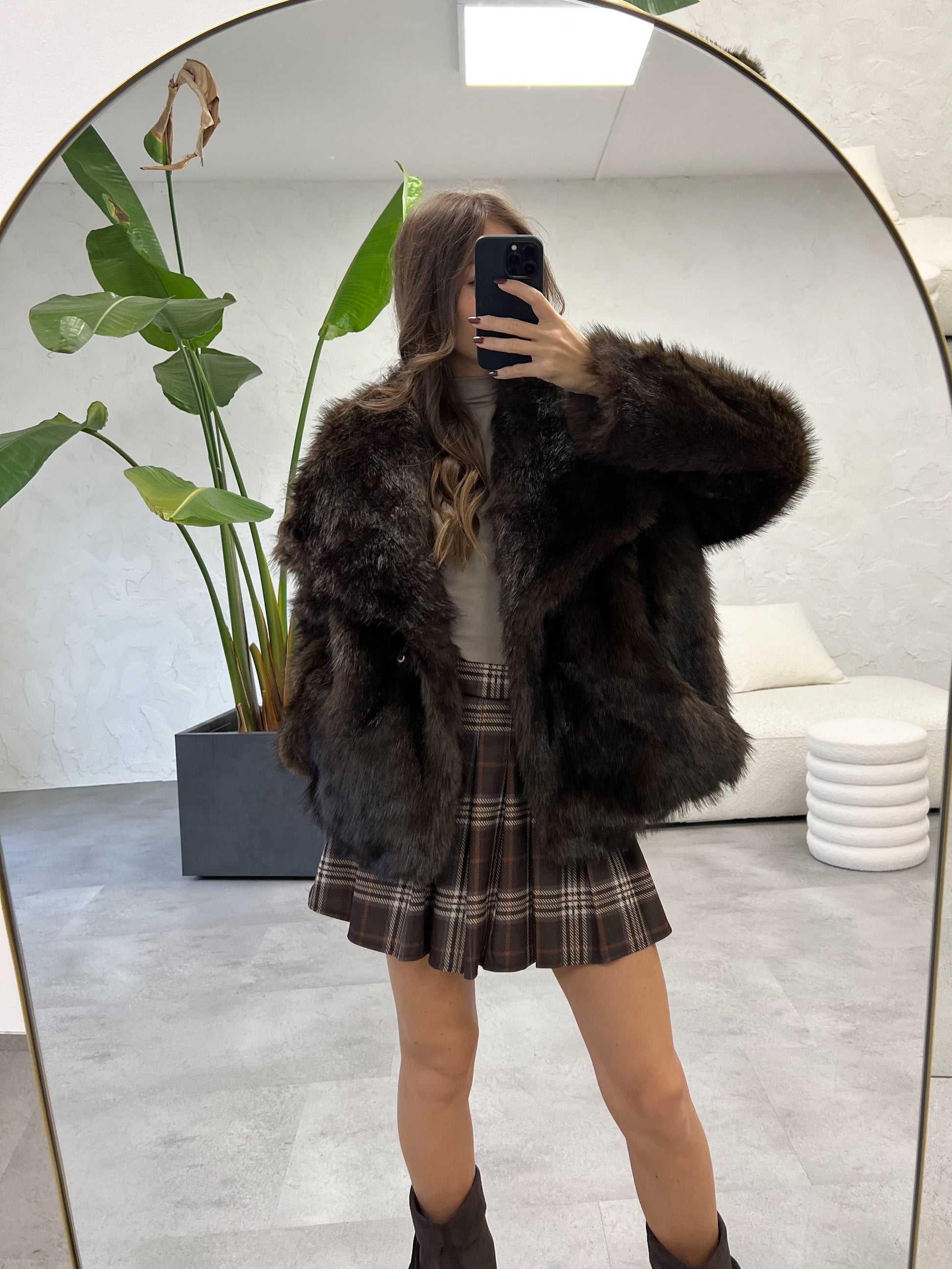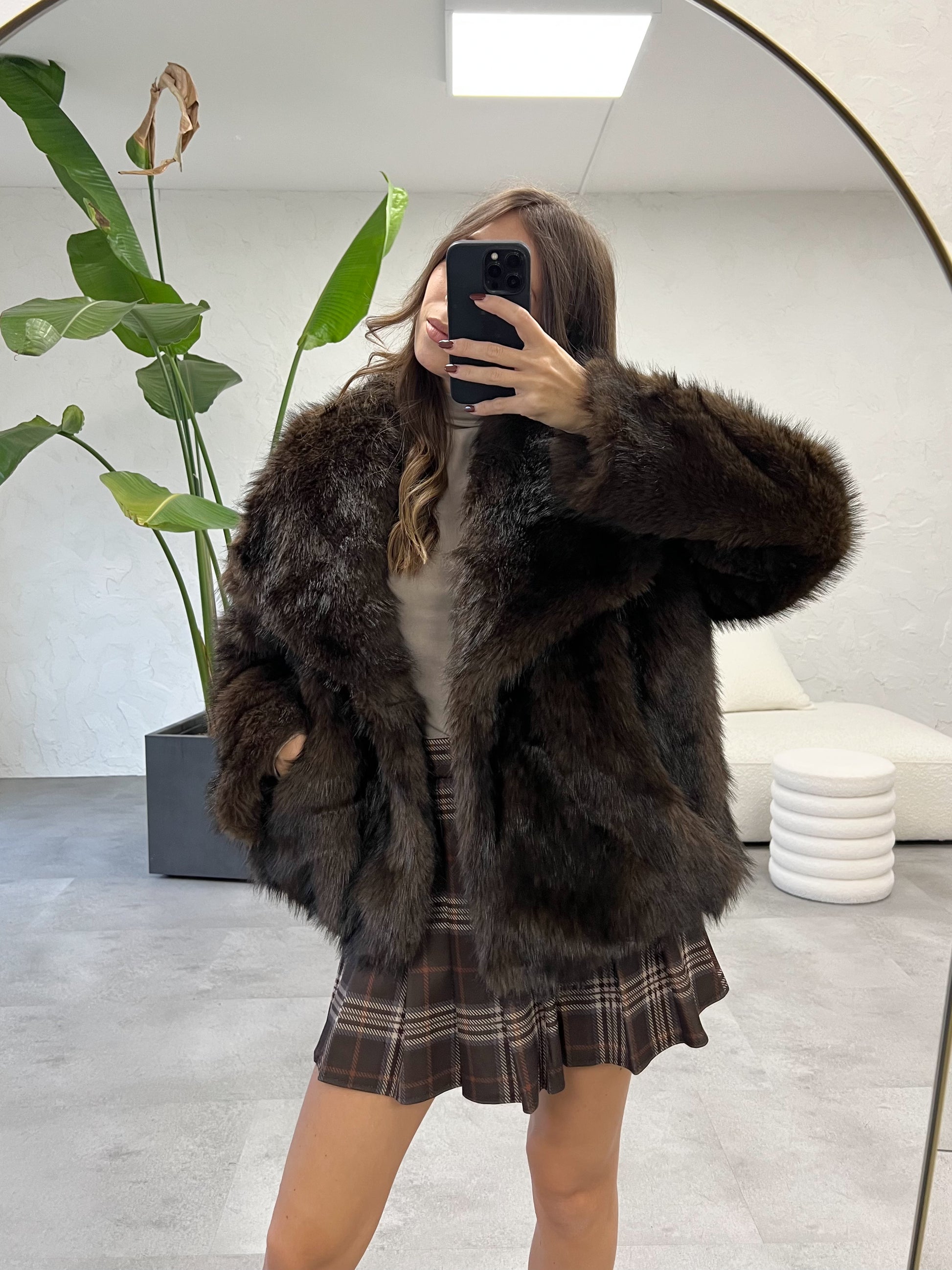 Giacca in pelliccia sintetica tinta unita cioccolato, collo a revers e tasche. Chiusura frontale con bottone, vestibilità regolare, taglia unica.
