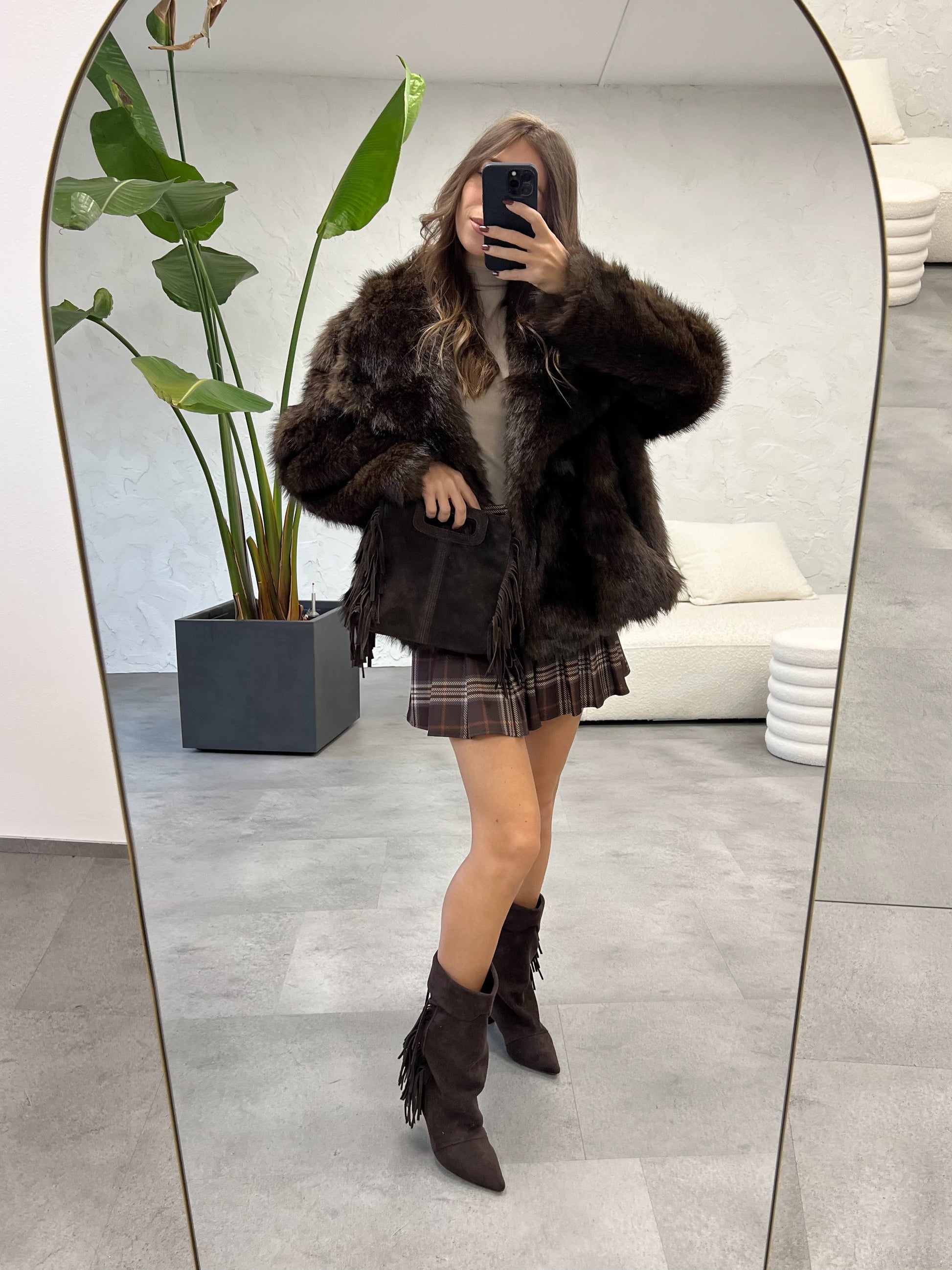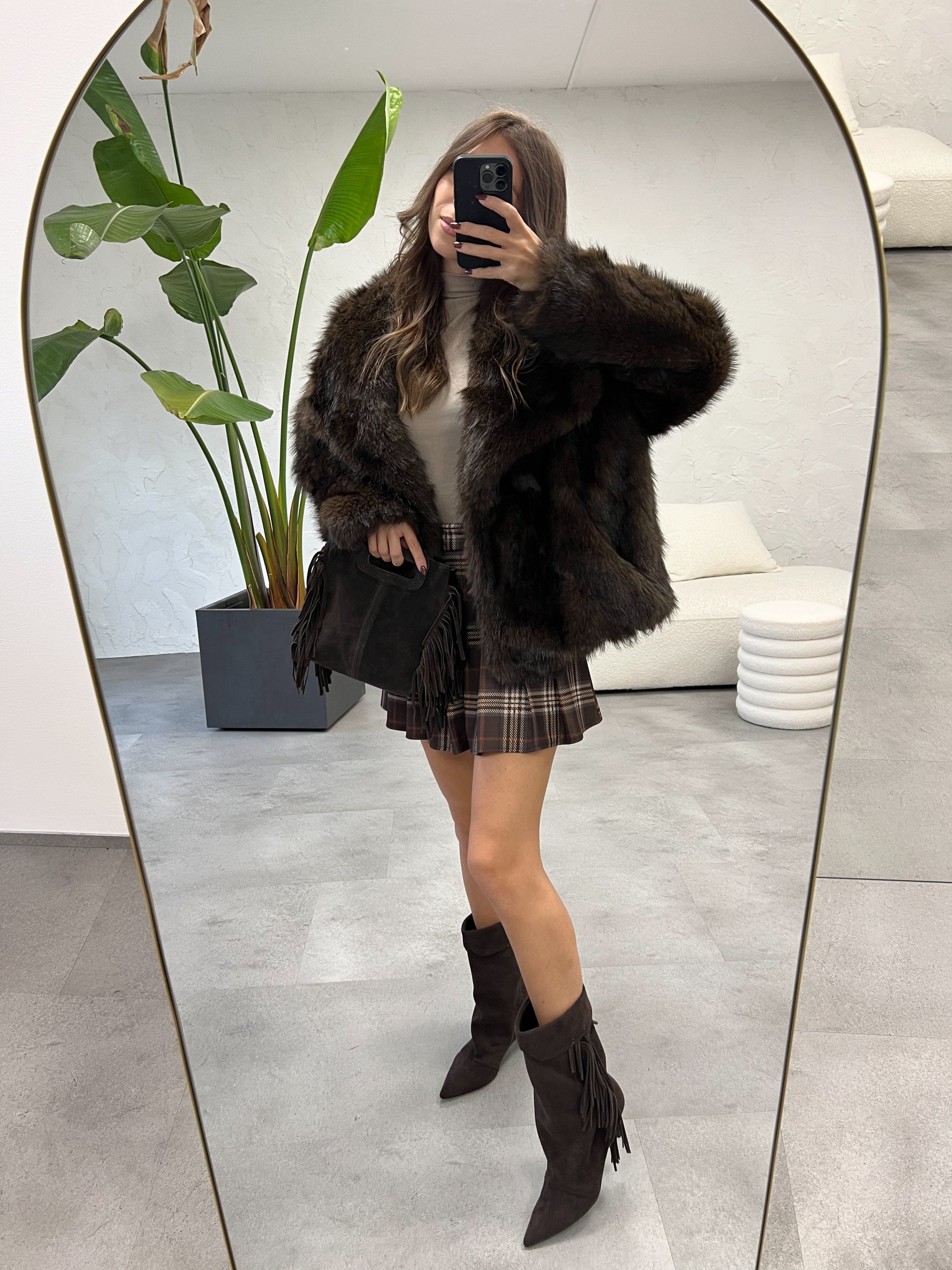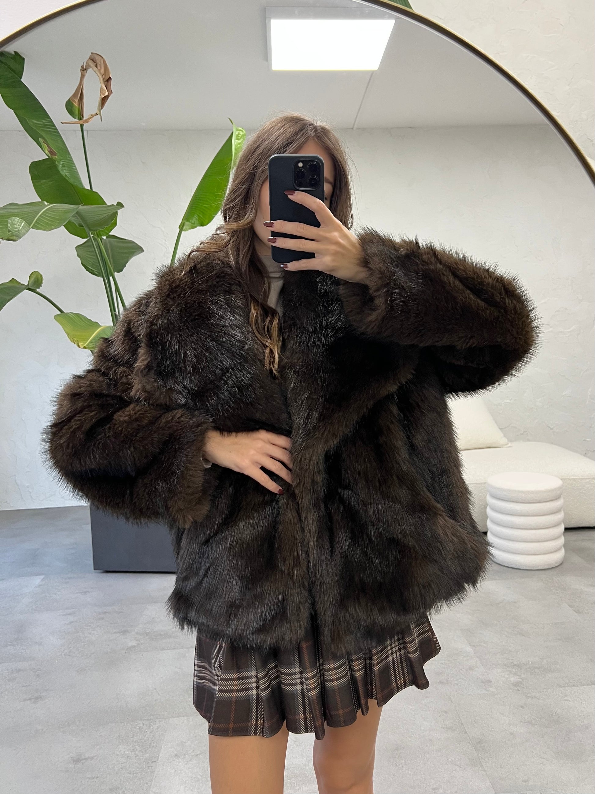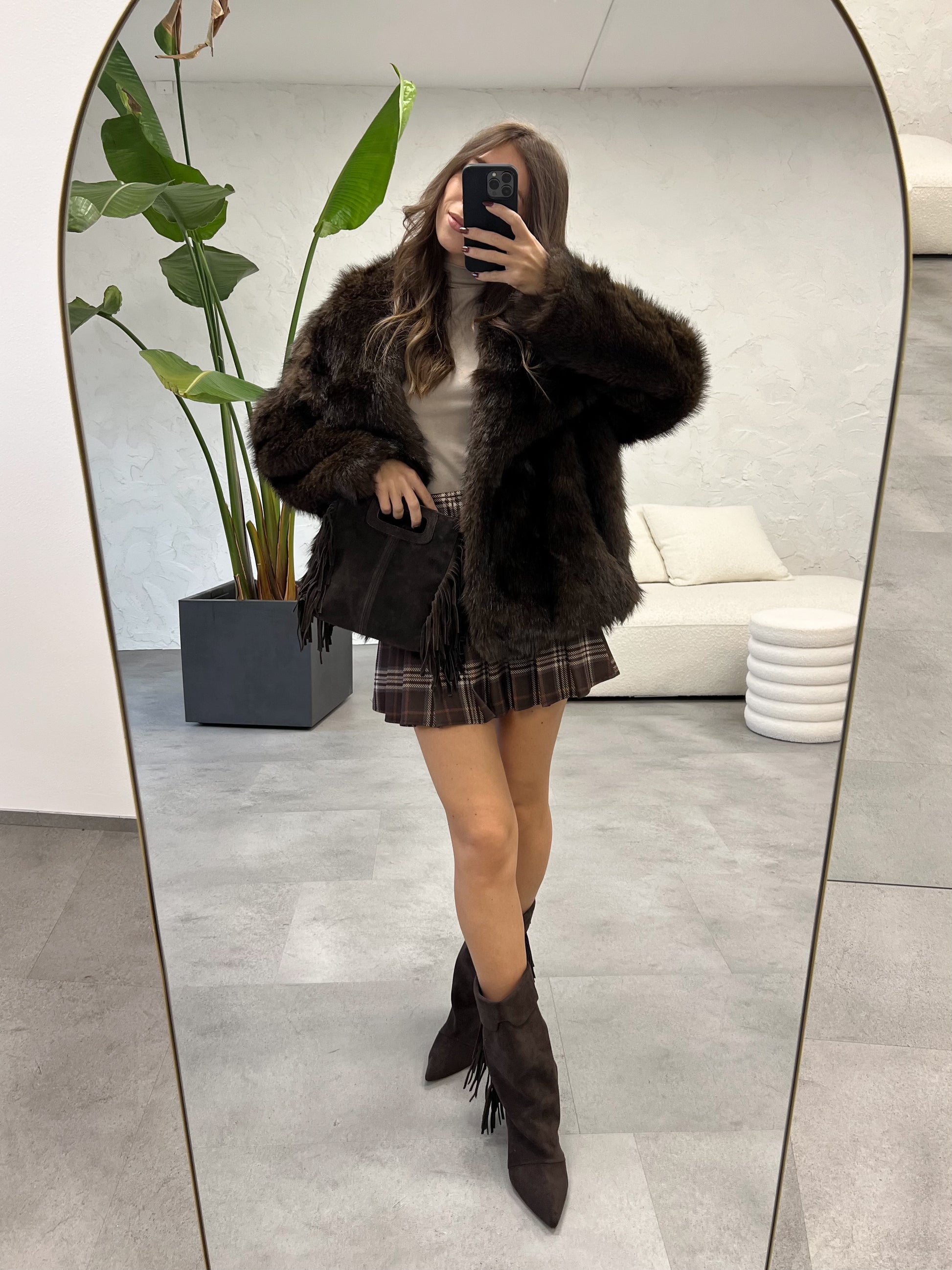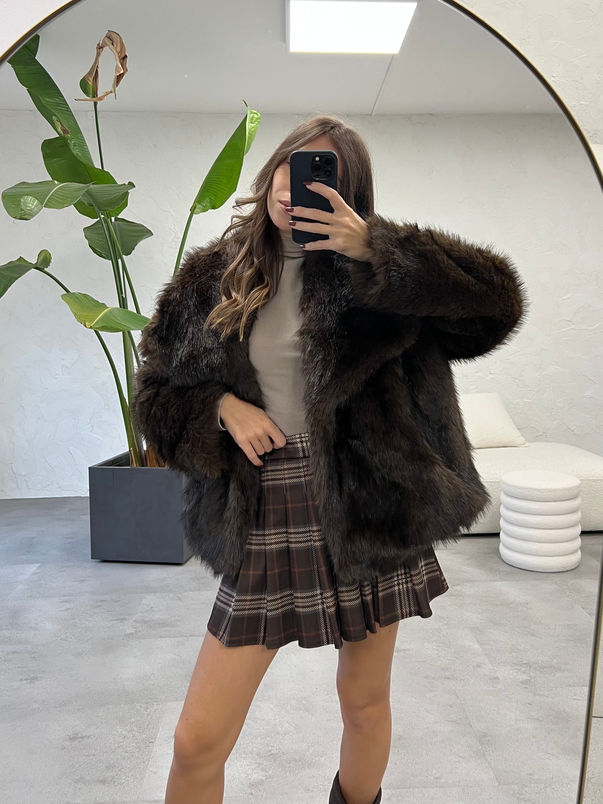 Giacca in pelliccia sintetica tinta unita cioccolato, collo a revers e tasche. Chiusura frontale con bottone, vestibilità regolare, taglia unica.