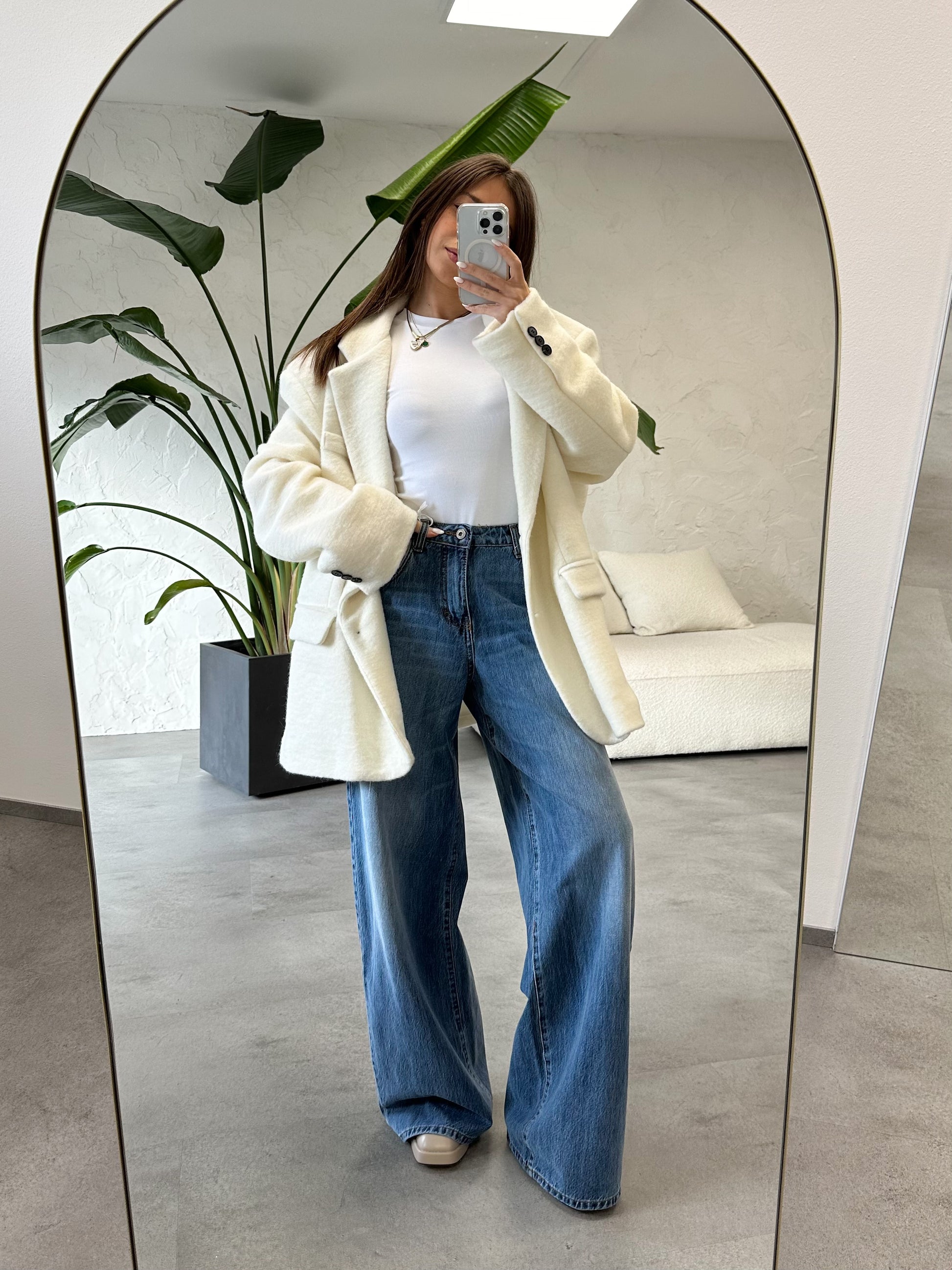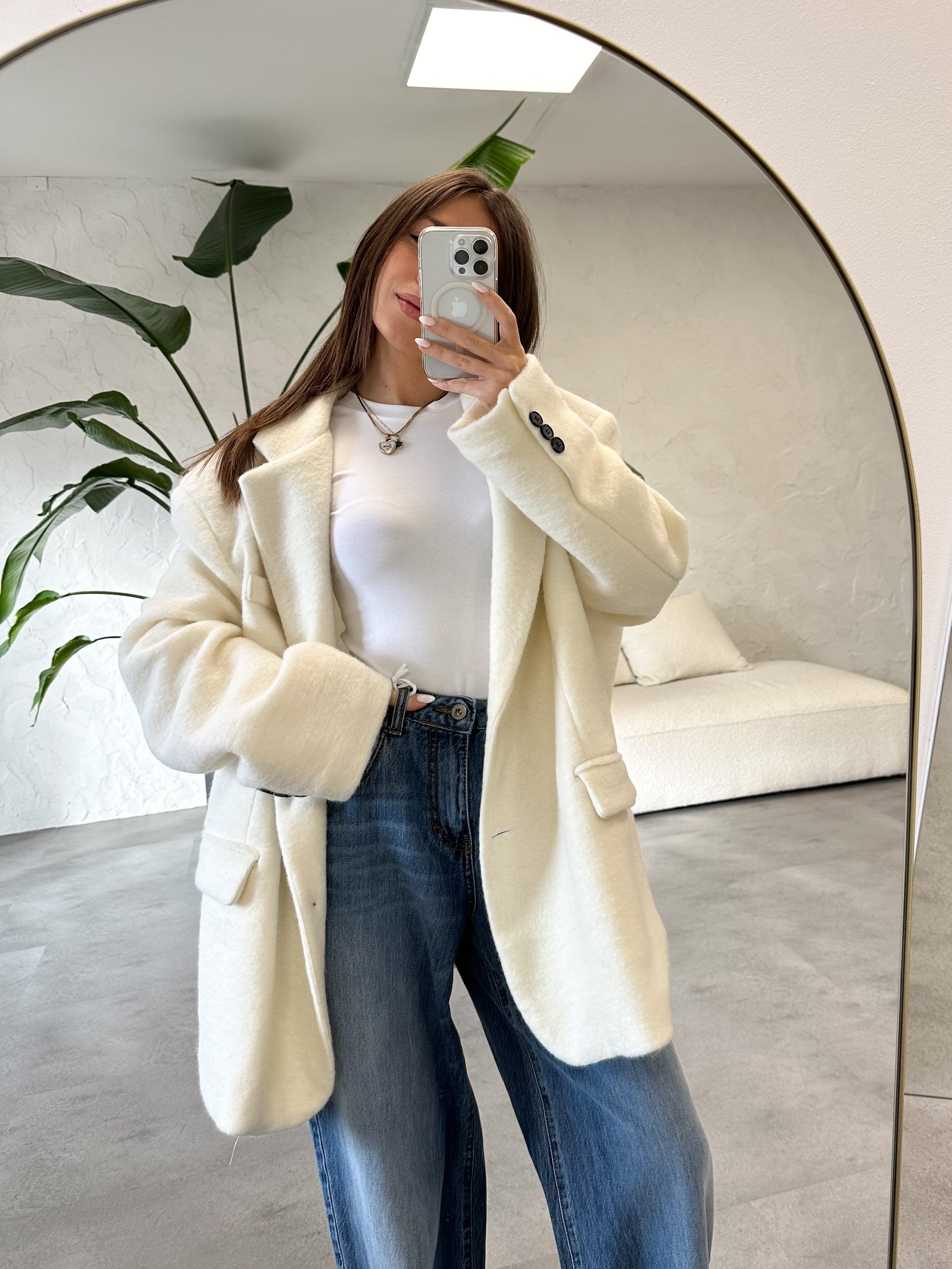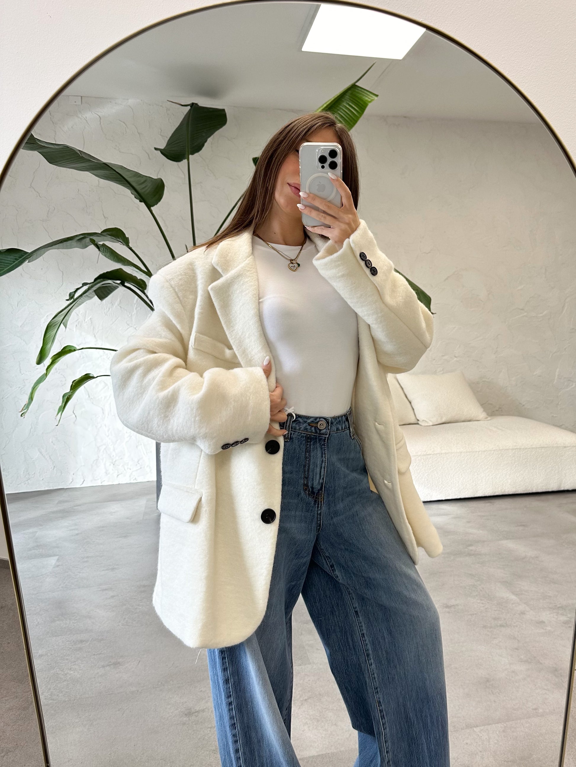 Giacca/cappotto oversize in lana cotta, foderata, con bottoni a contrasto neri.