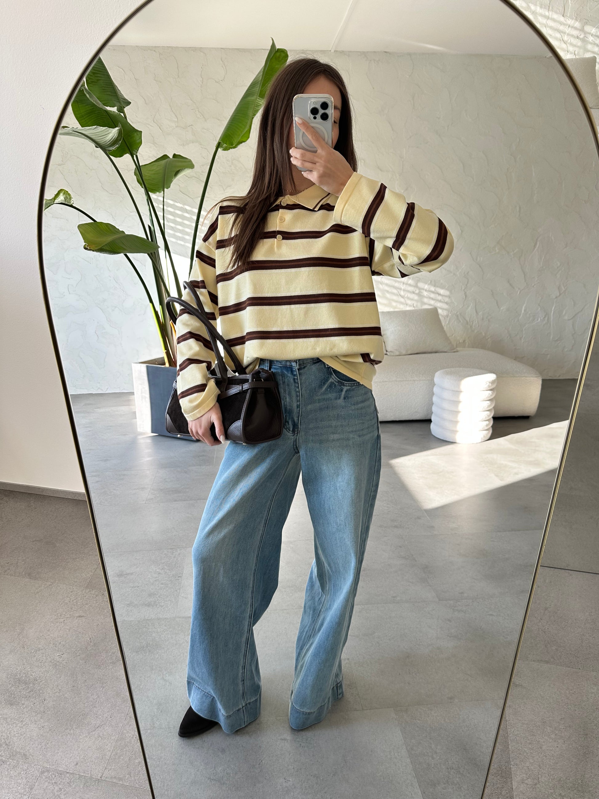 Maglia con colletto a polo, fantasia righe, giallo burro e marrone. Vestibilità over, taglia unica.