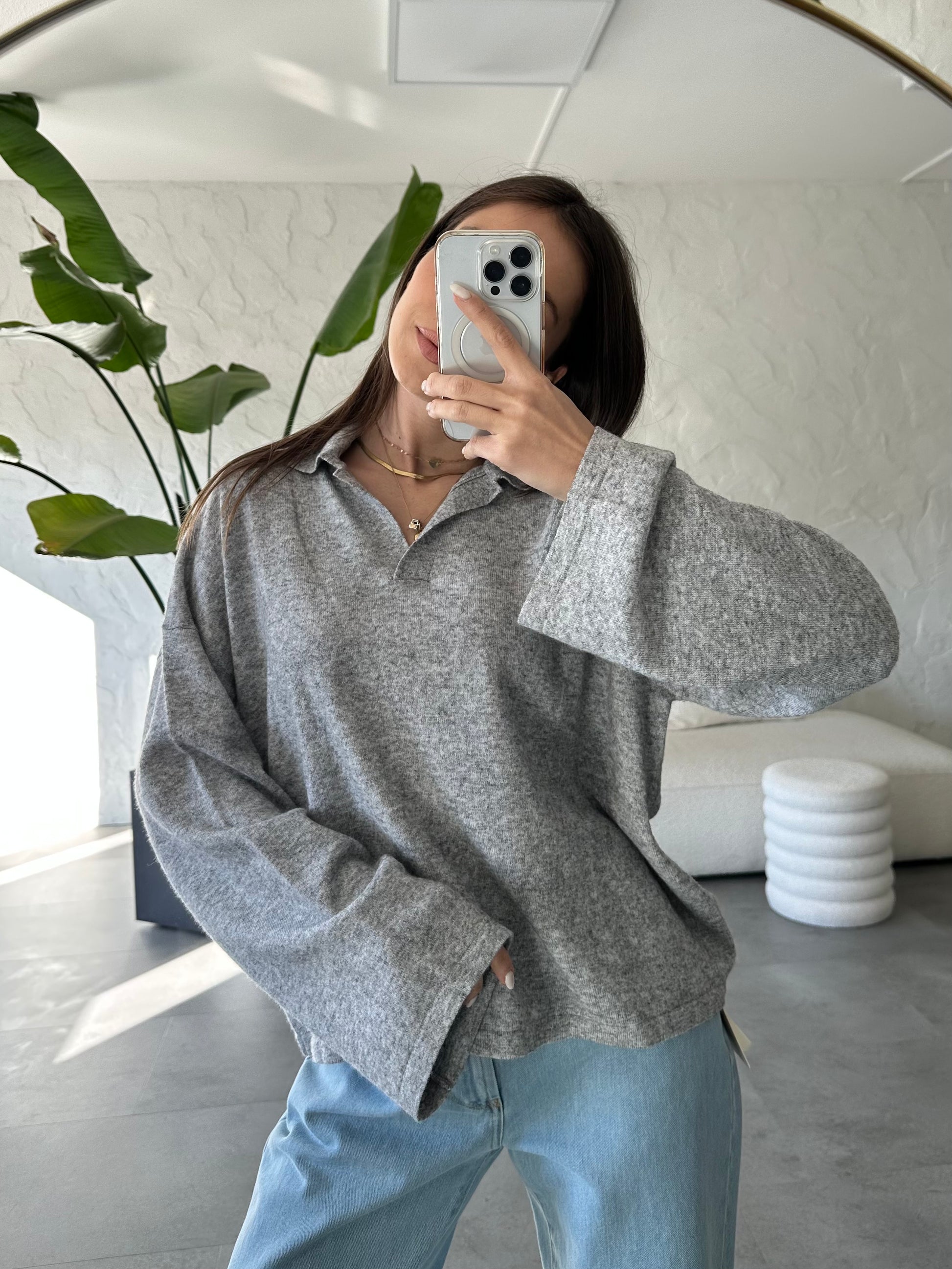 Polo in maglia di Vicolo, modello ampio, dettaglio colletto e maniche ampie, colore grigio. Taglia unica.