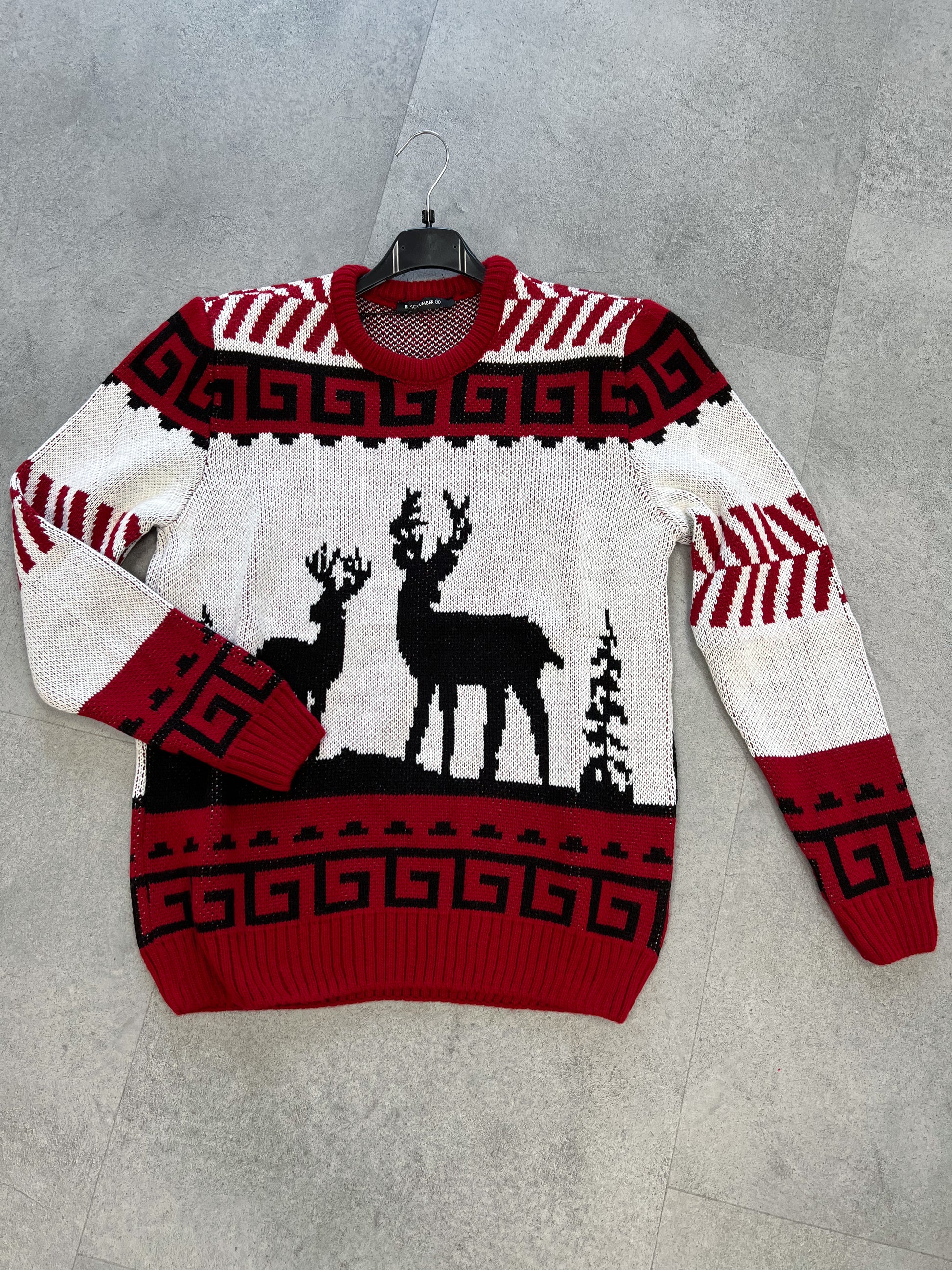 Morbido maglione girocollo con motivo renne nelle tonalità del rosso, nero e bianco. Va a taglie.