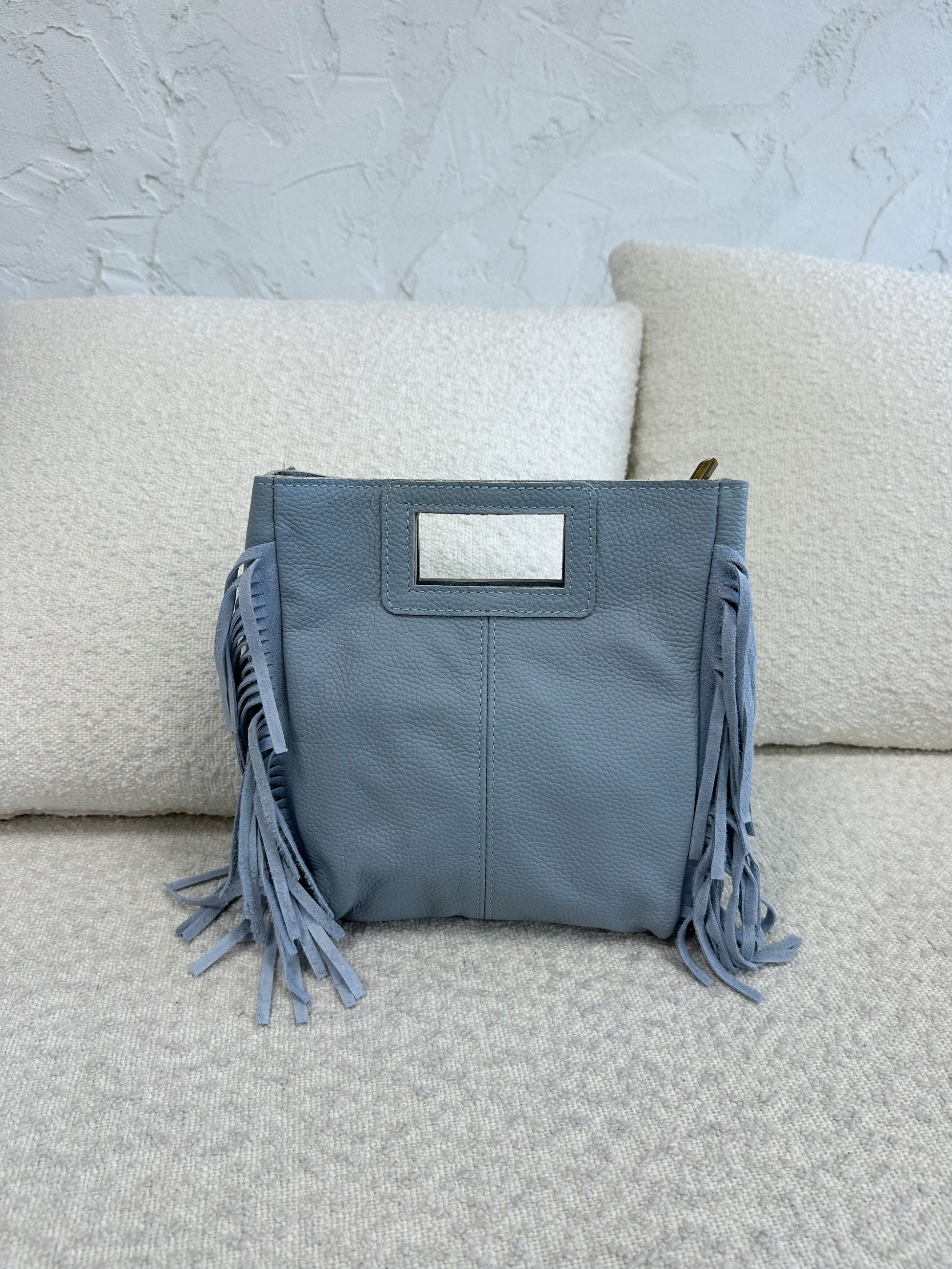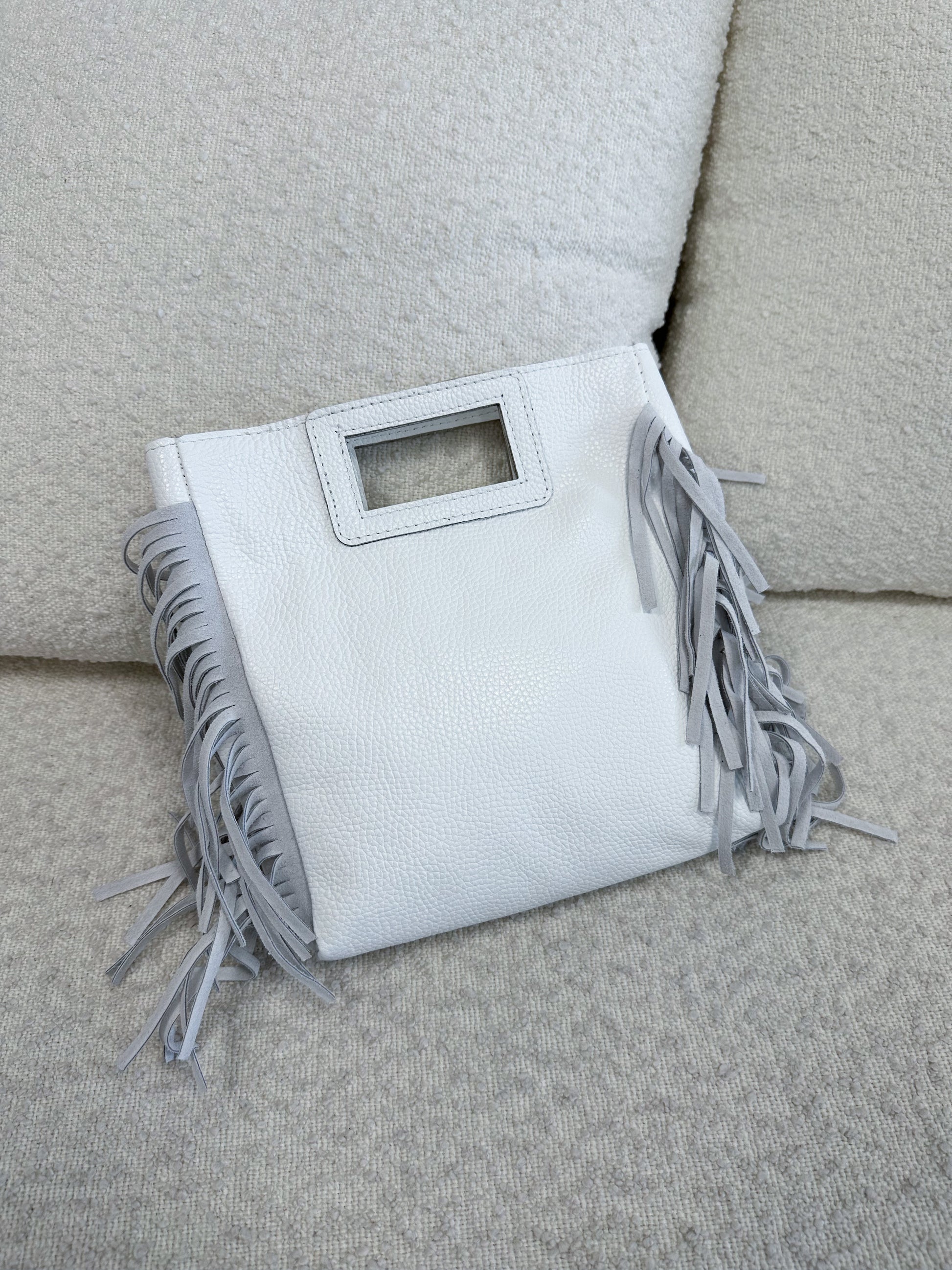 Mini borsa in vera pelle con frange, tracolla lunga inclusa.