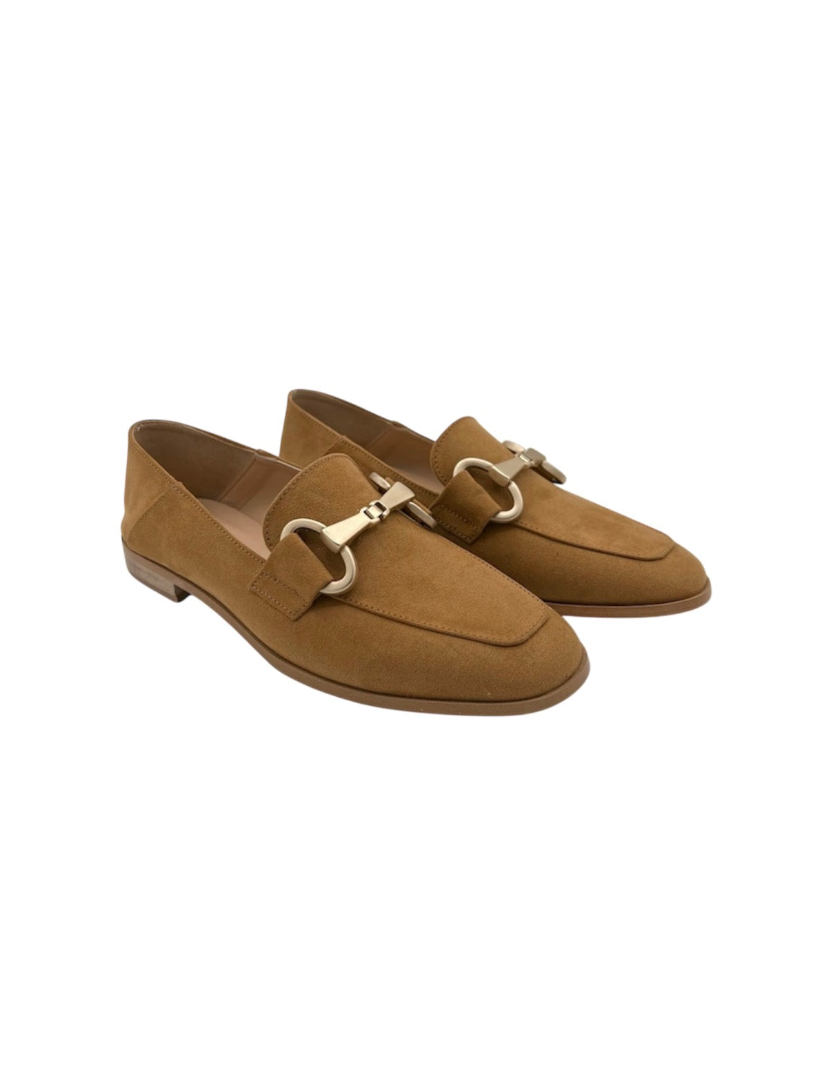 Mocassino cuoio con morsetto dorato, in simil camoscio.