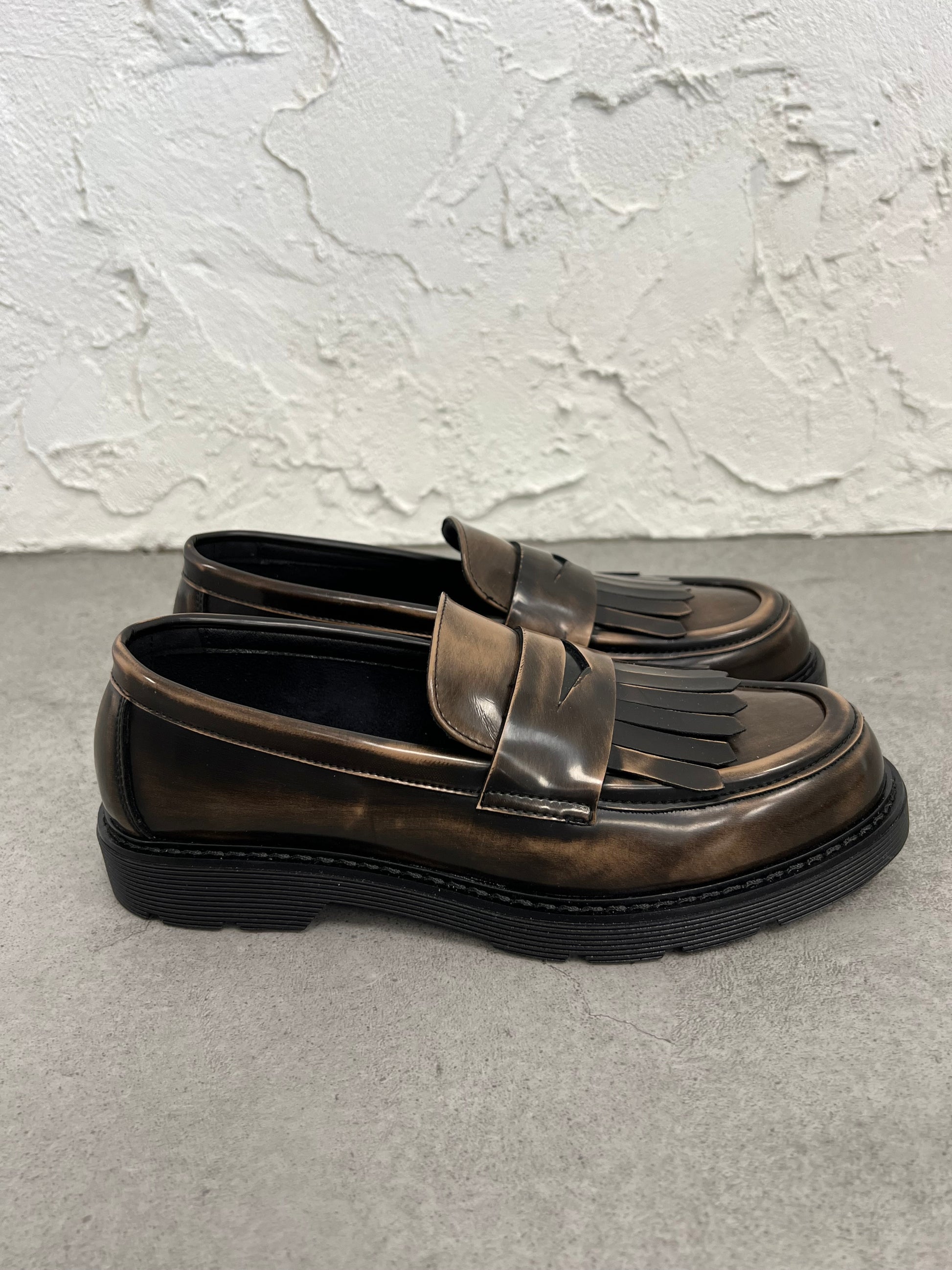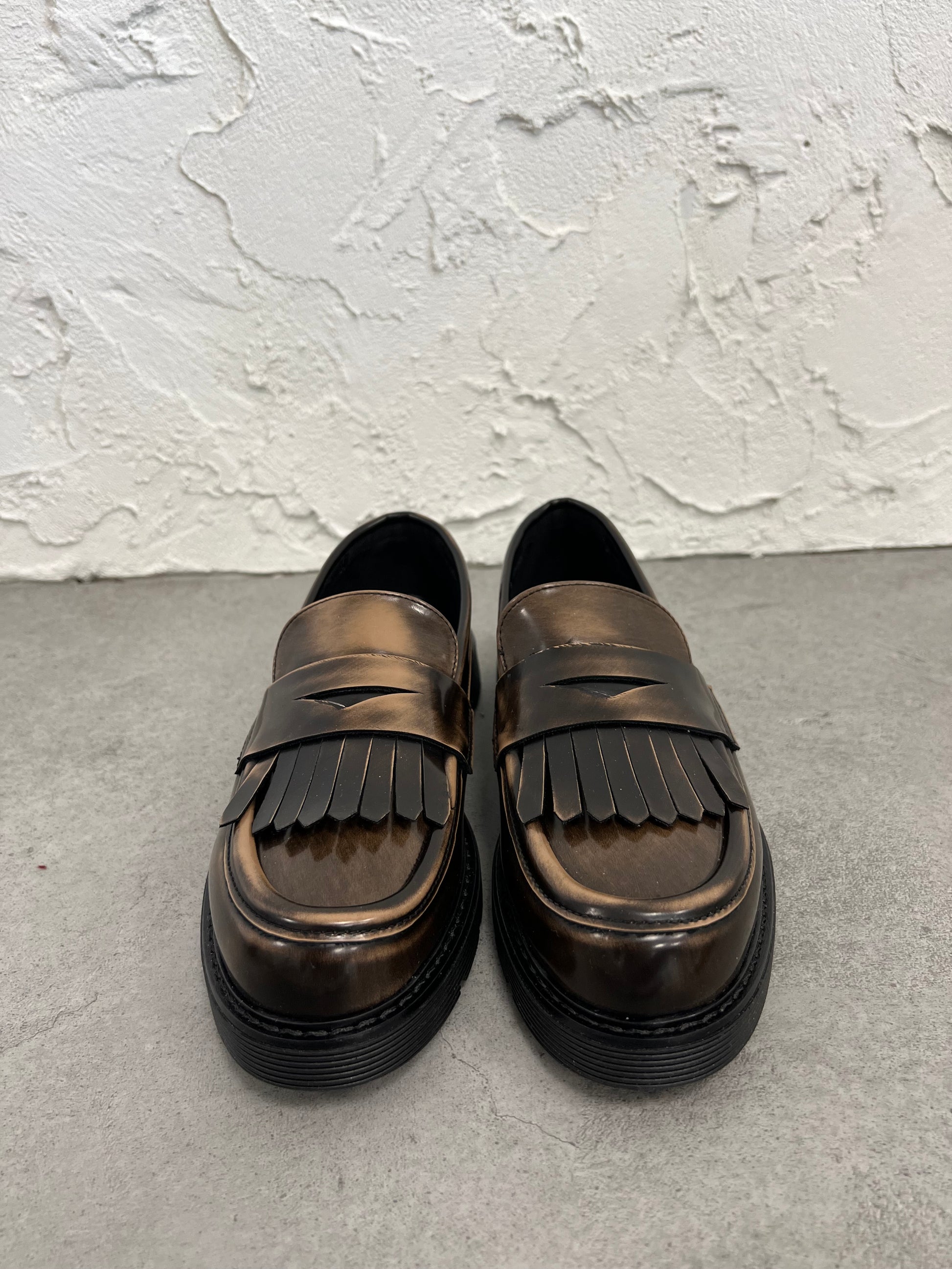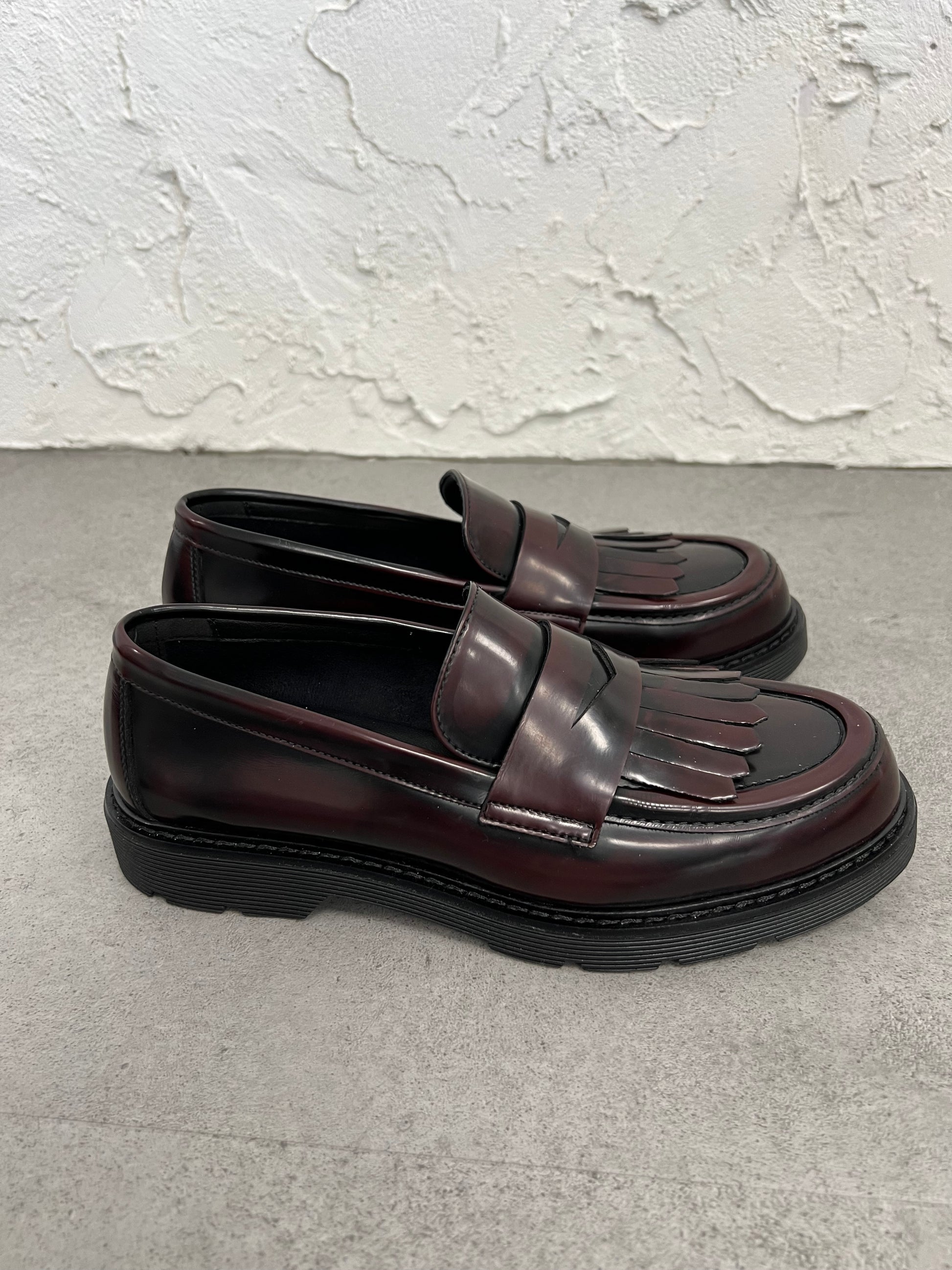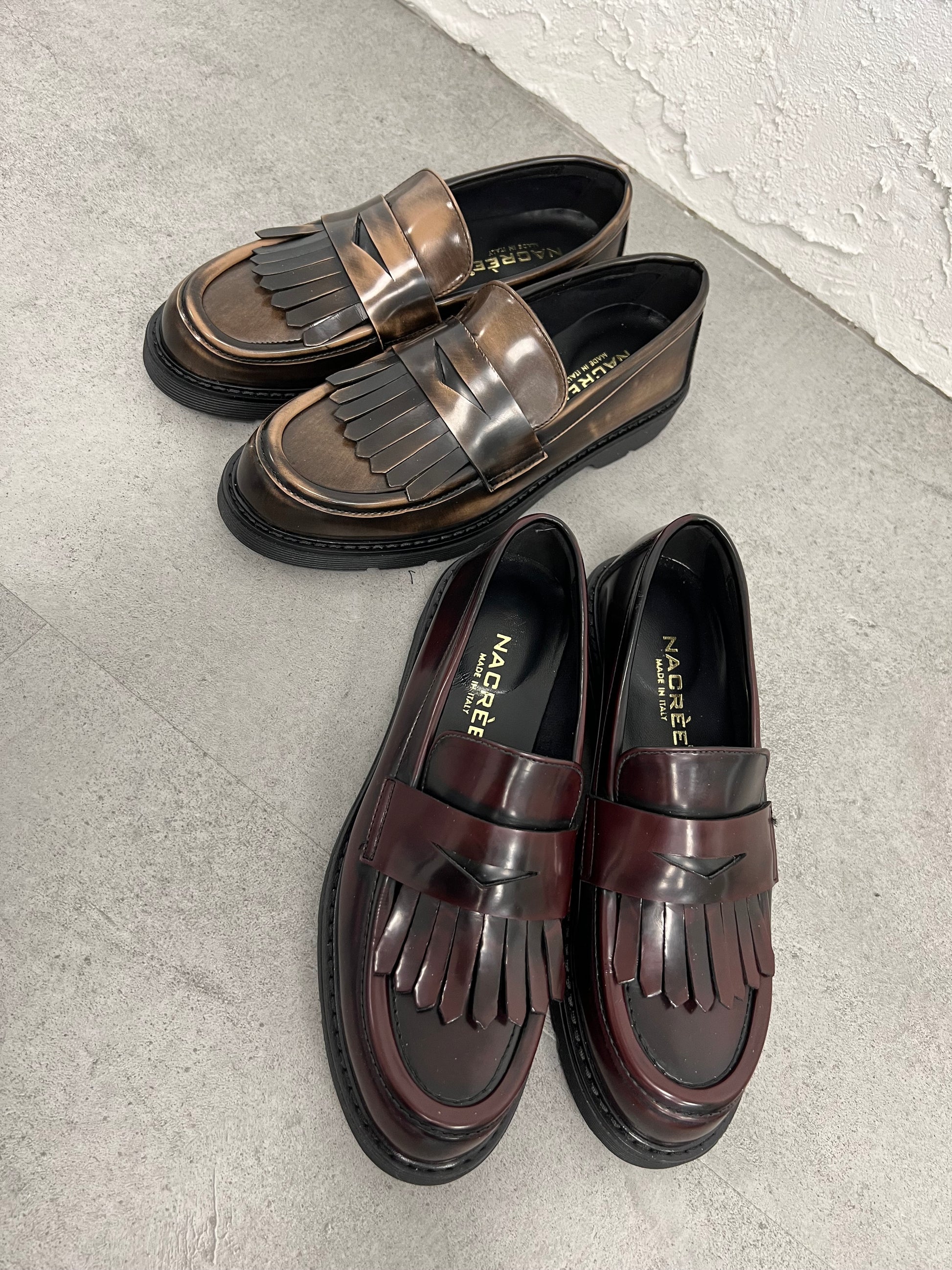 Mocassino in simil pelle lucida nera spazzolato in bordeaux e taupe, con dettaglio frange davanti.