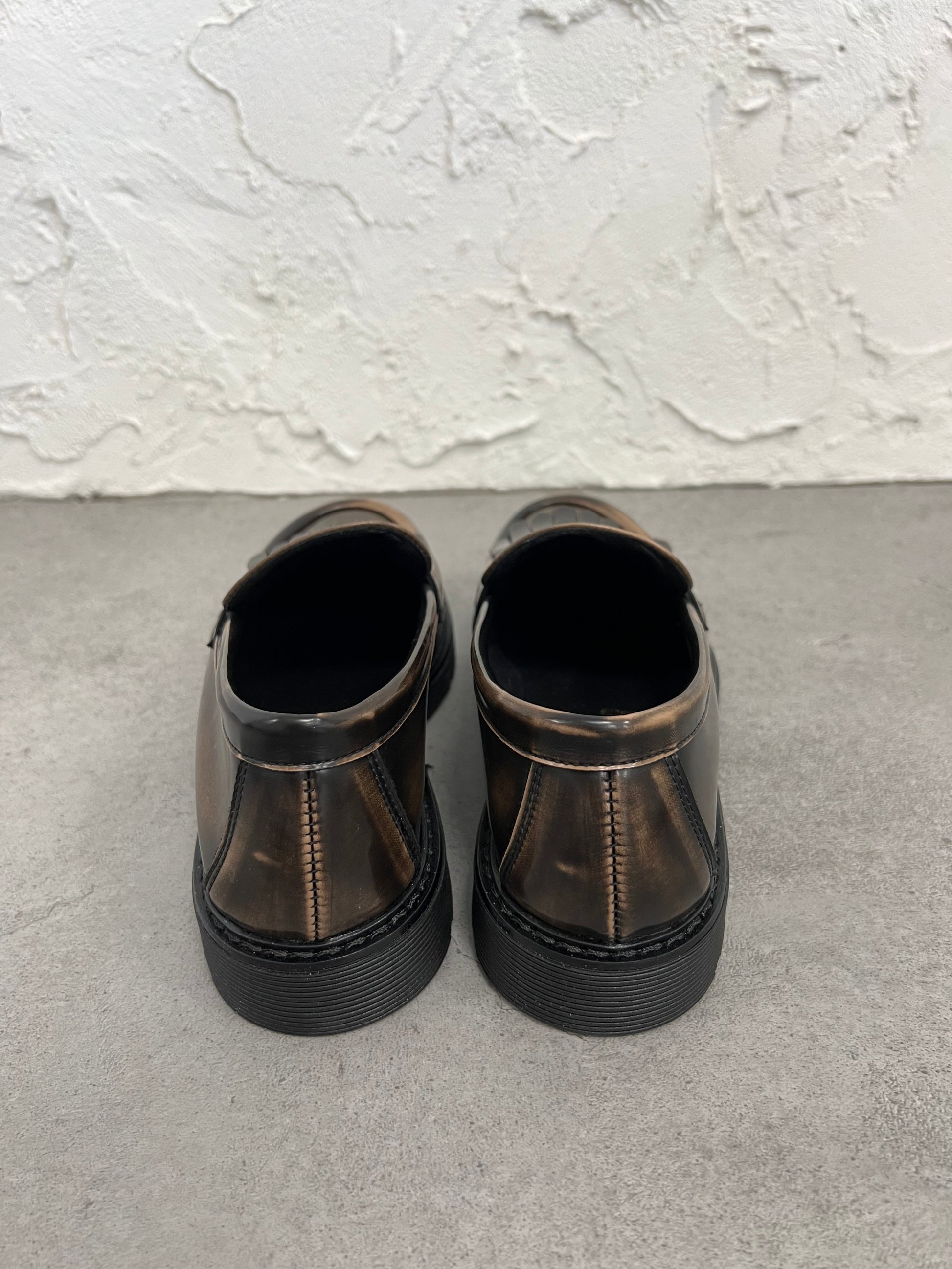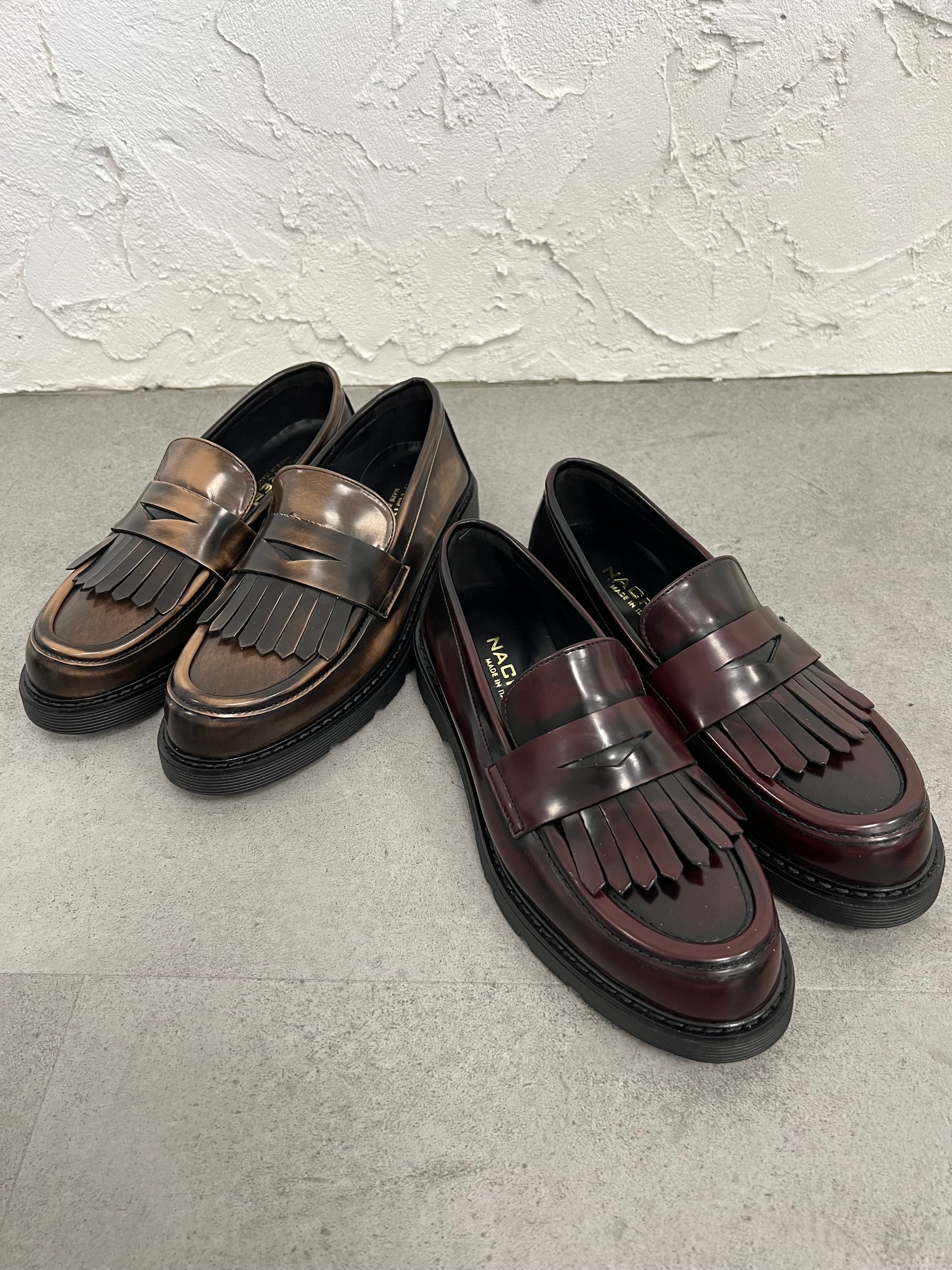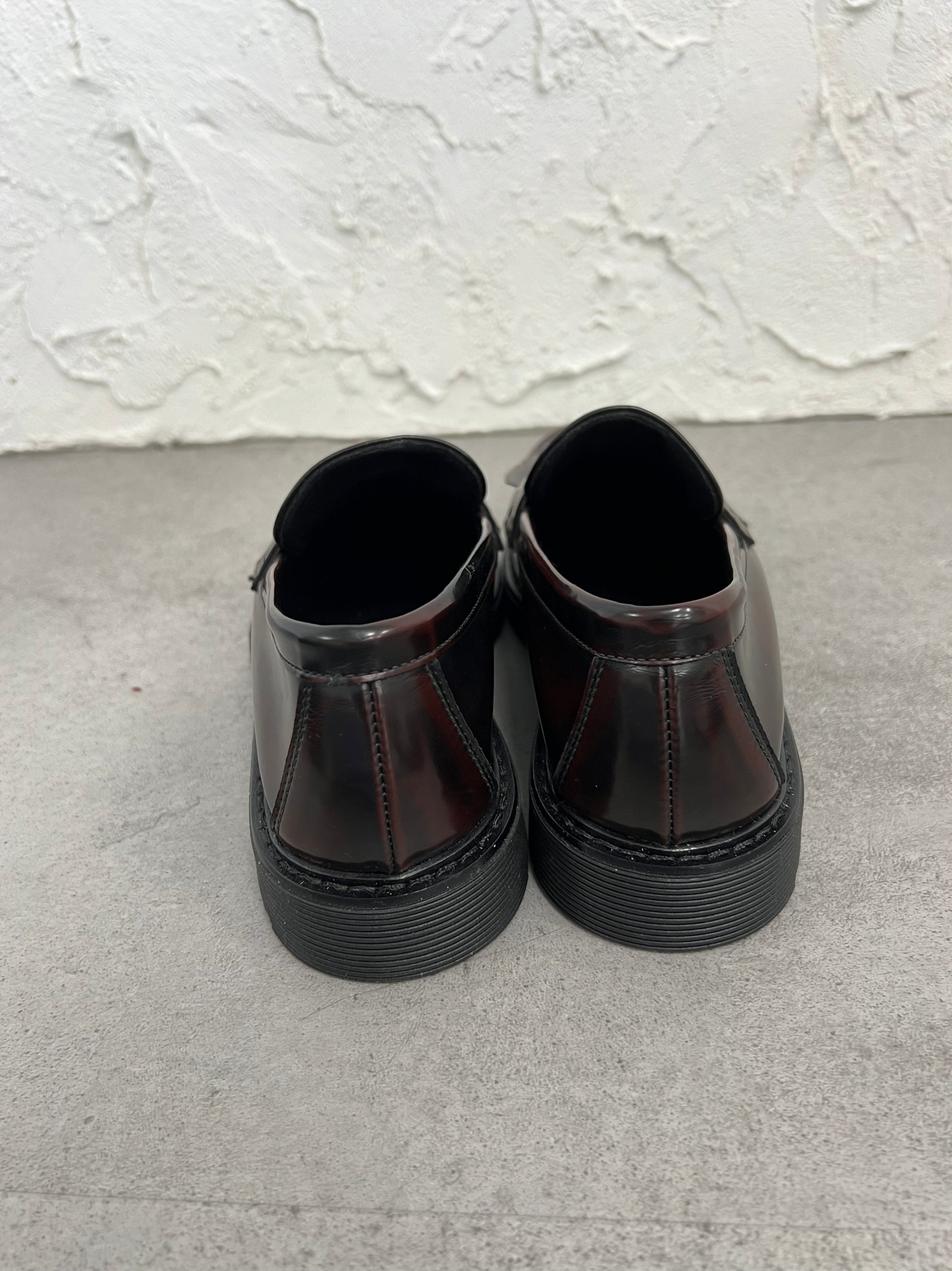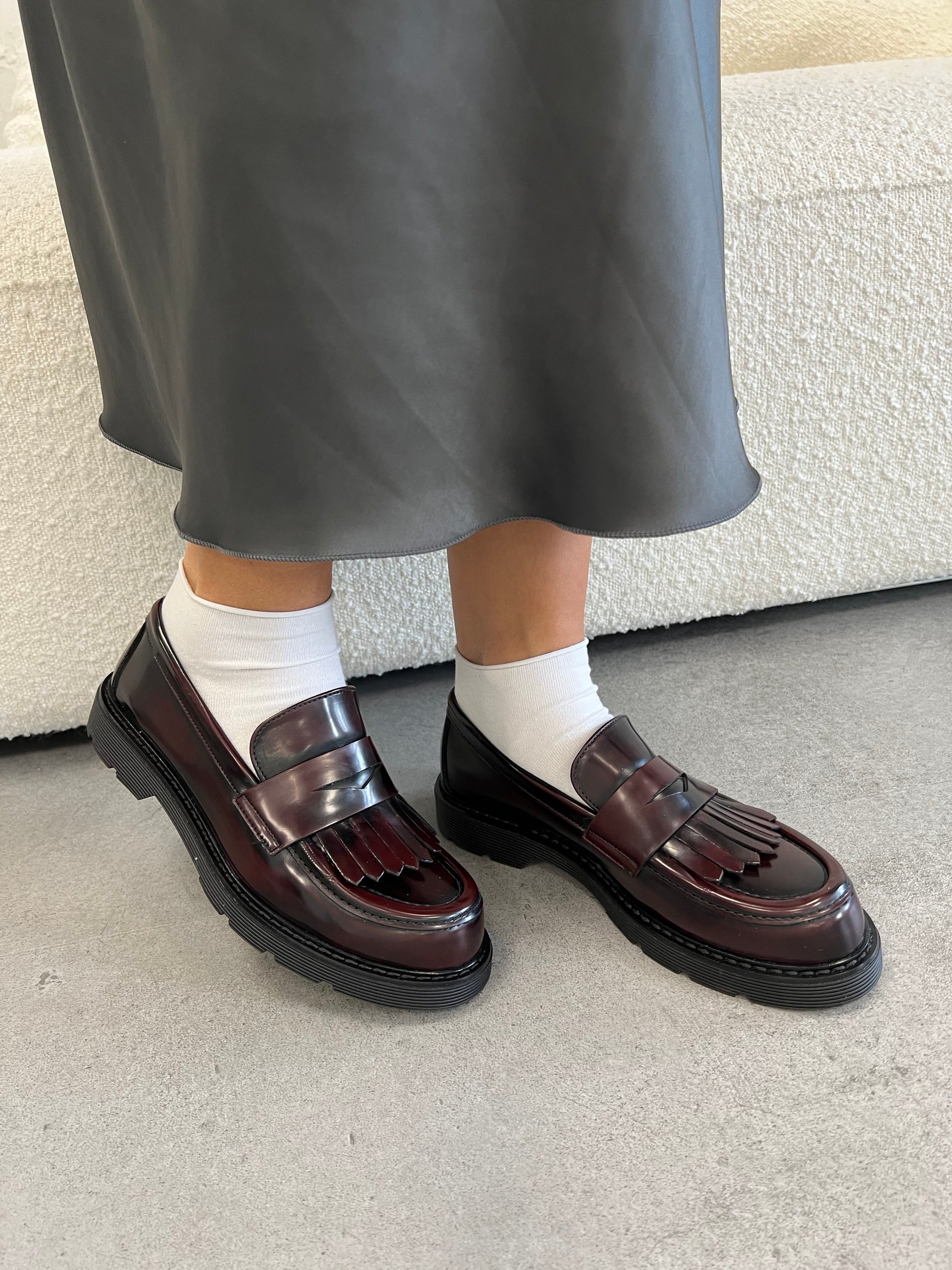 Mocassino in simil pelle lucida nera spazzolato in bordeaux e taupe, con dettaglio frange davanti.