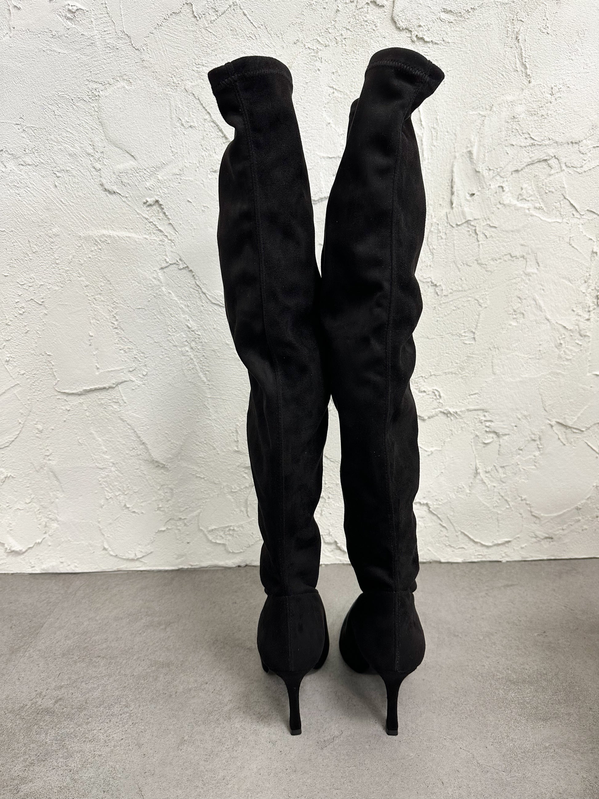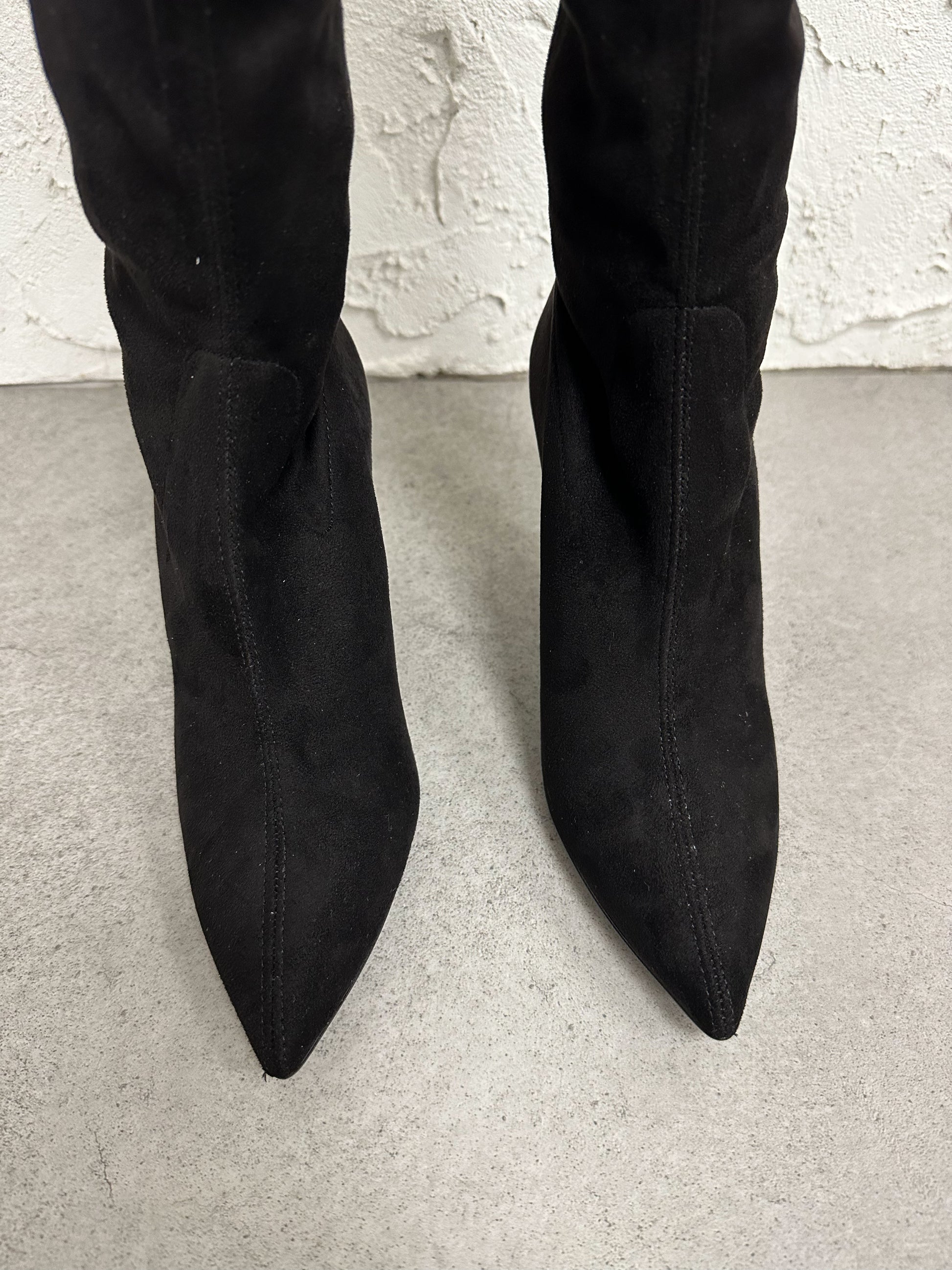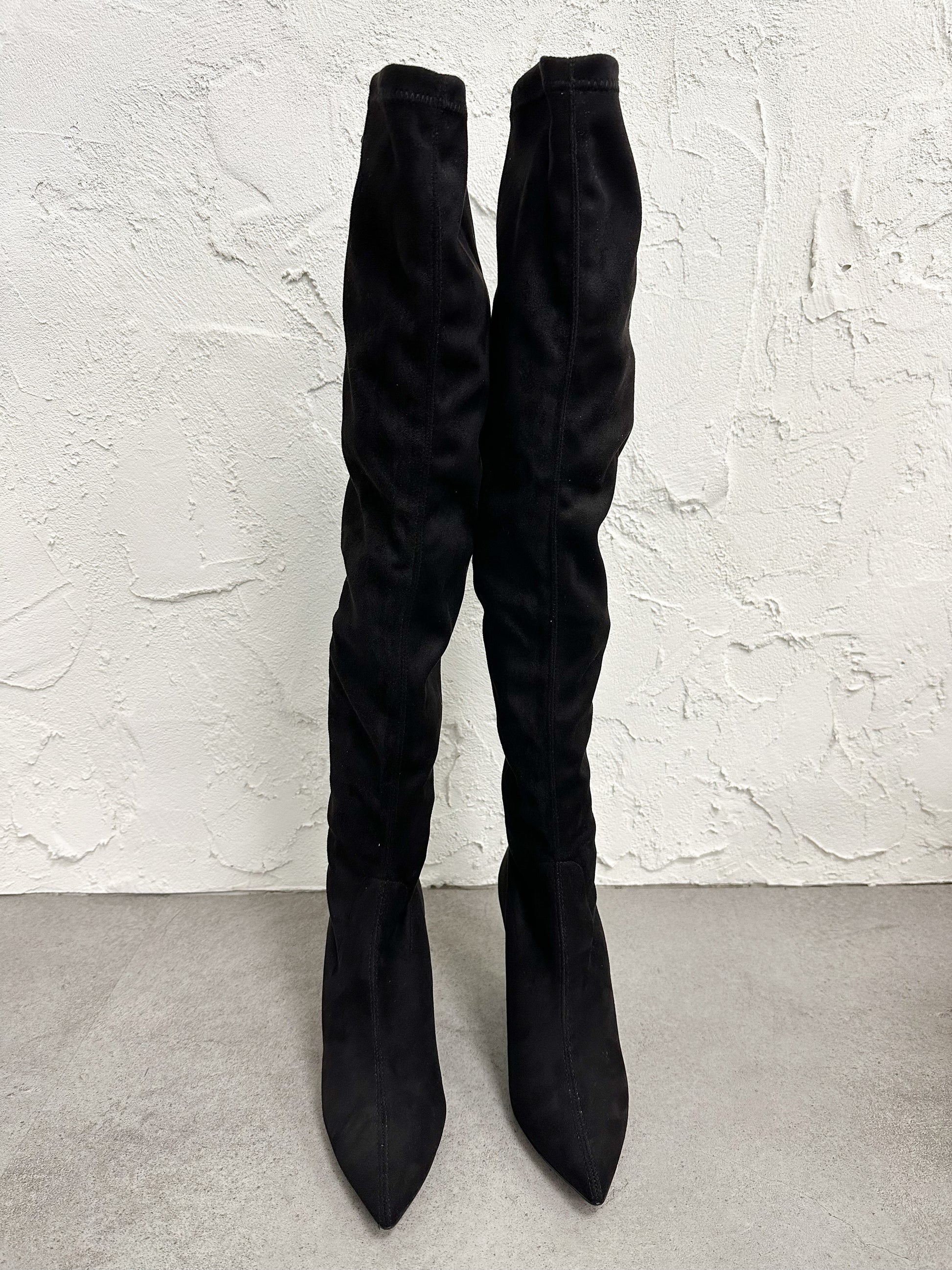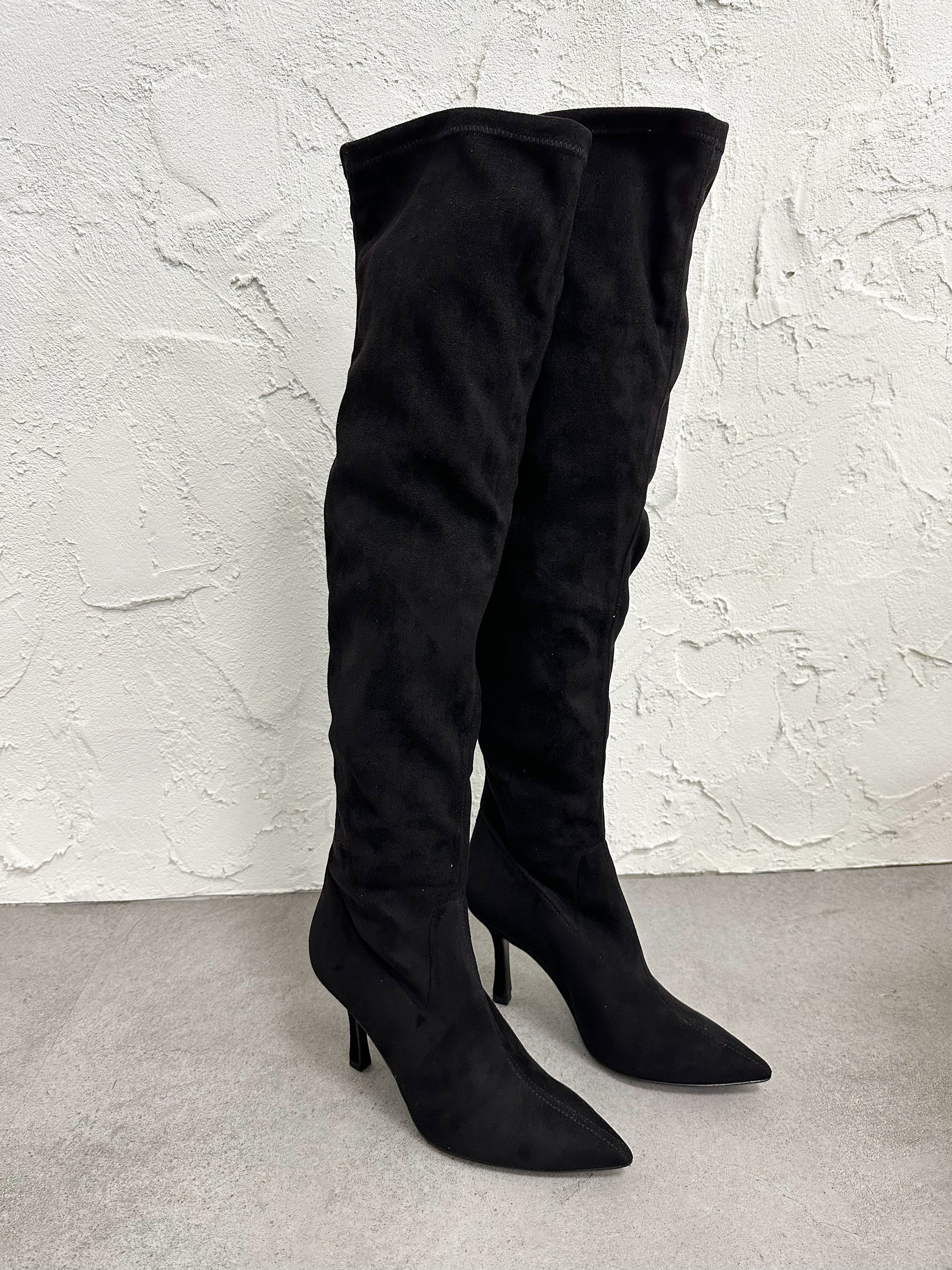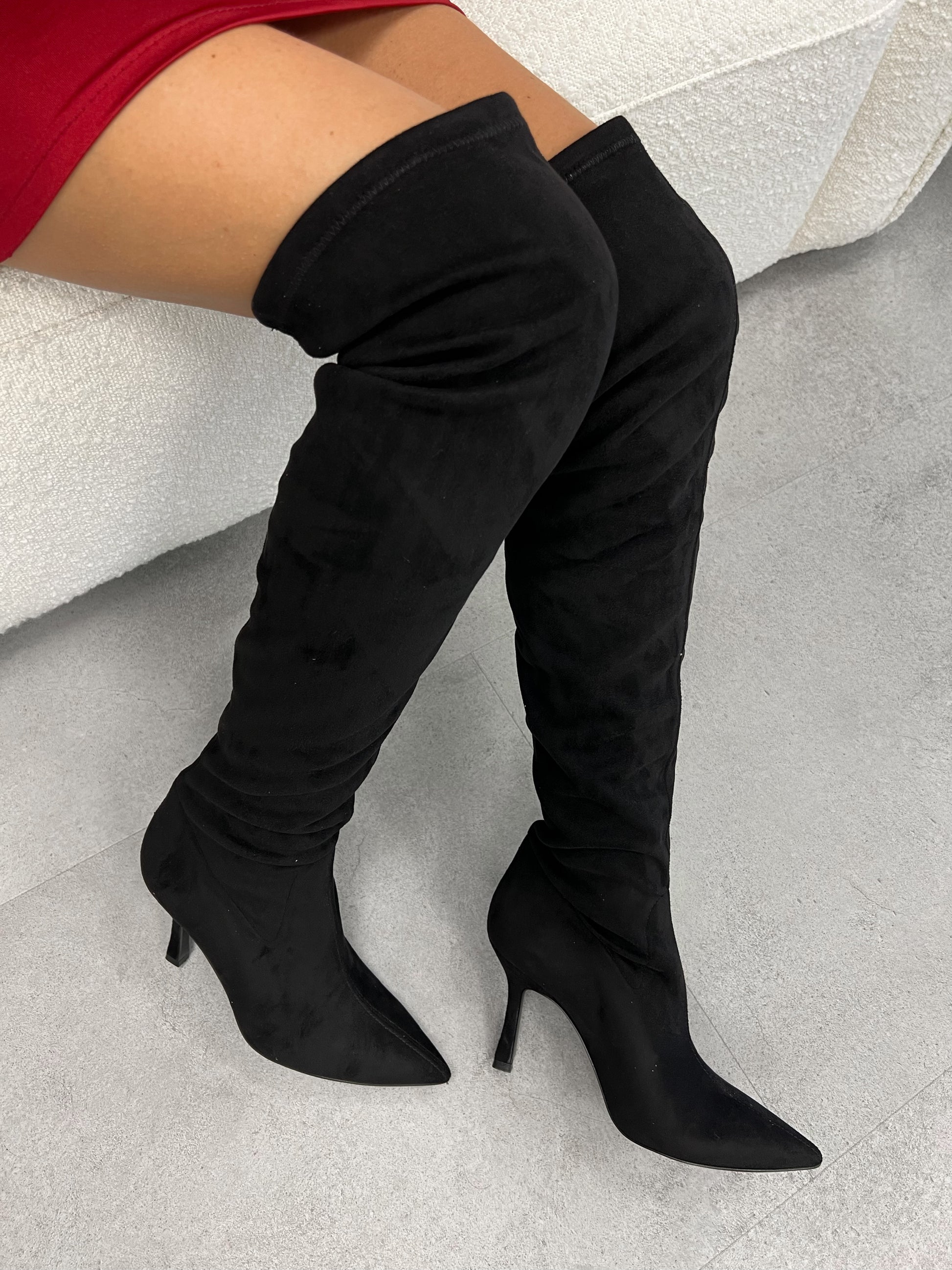 Stivale in eco camoscio aderente, alto sopra al ginocchio con tacco 9cm.