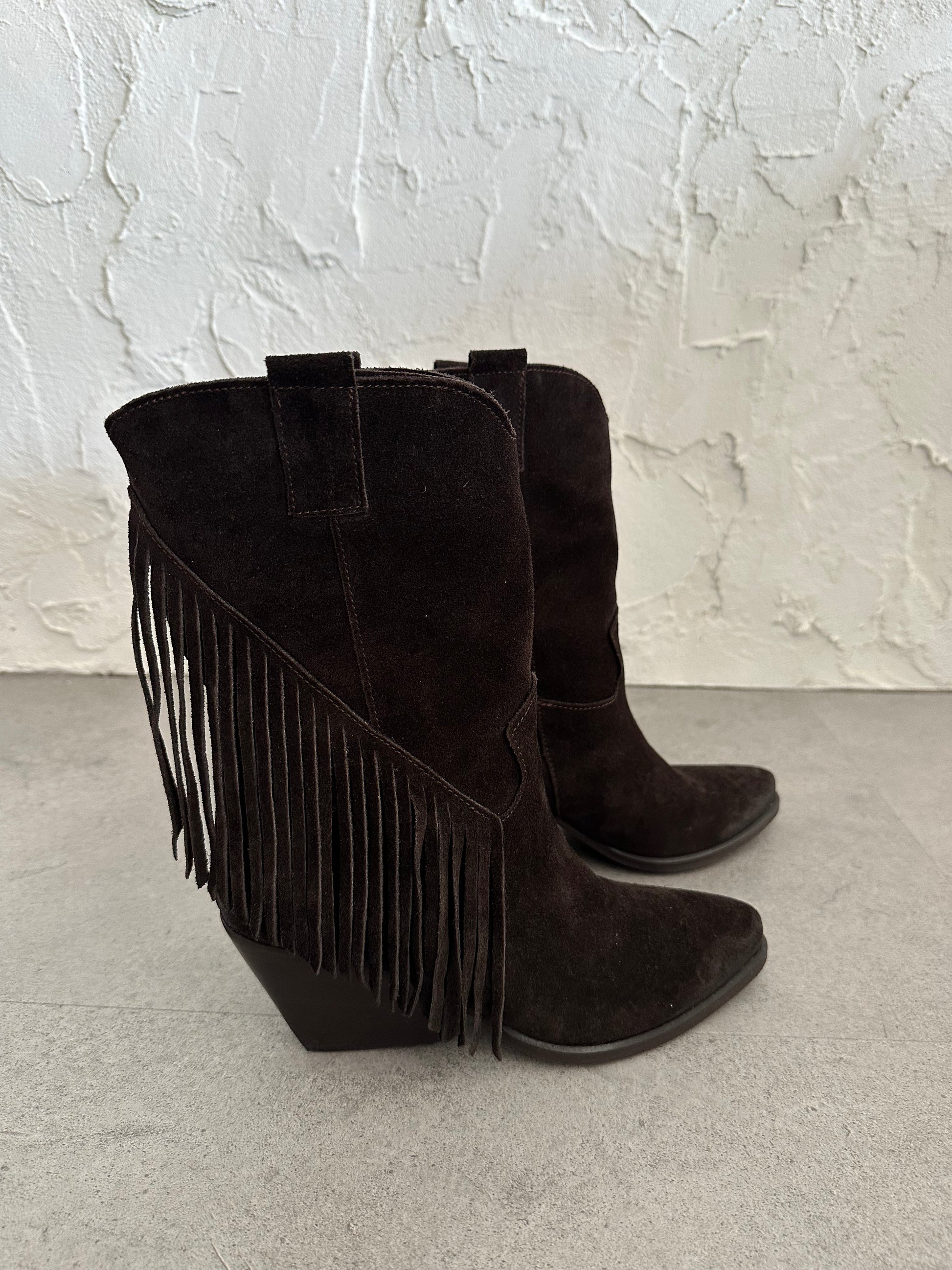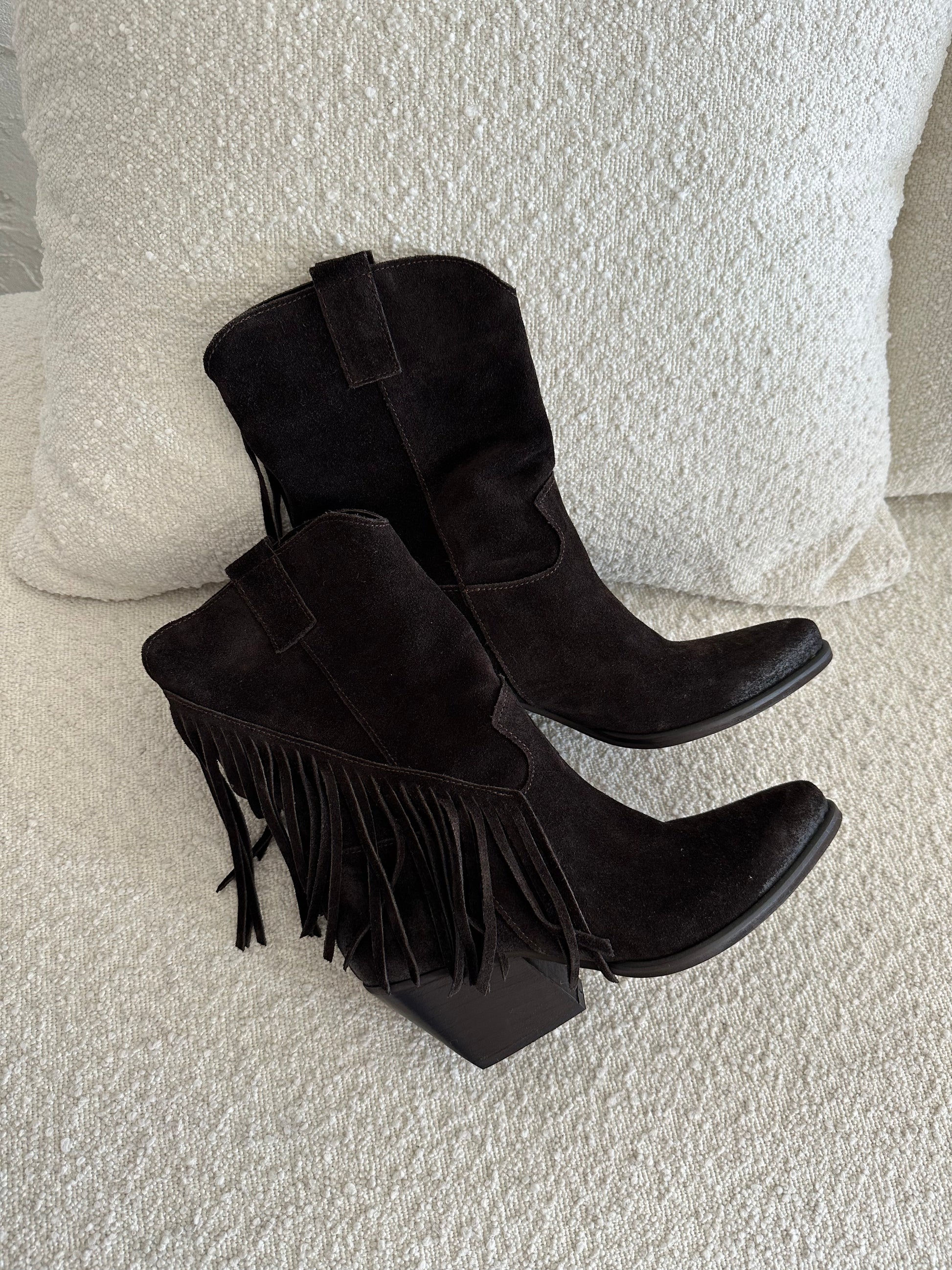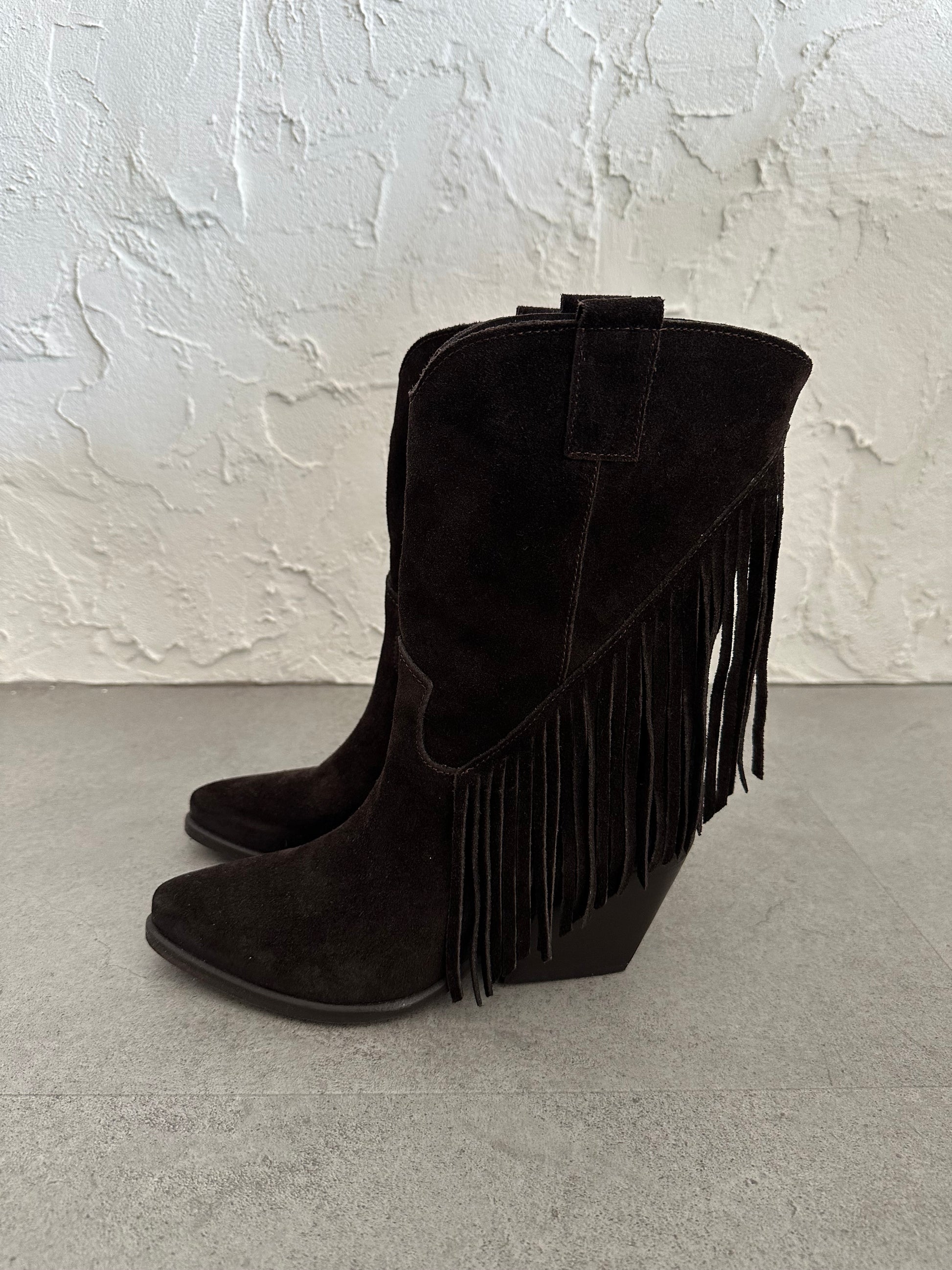 Texano in vero camoscio testa di moro con dettaglio frange, media altezza gambale, tacco 7 cm.