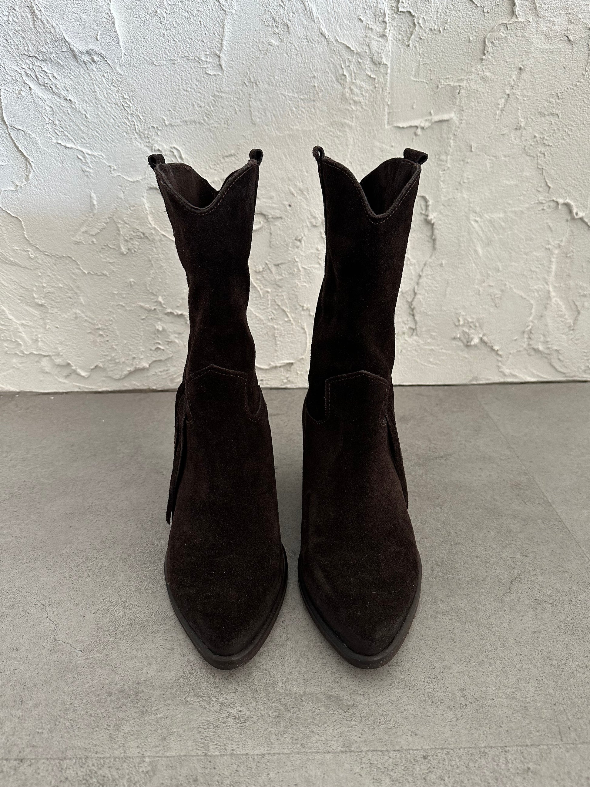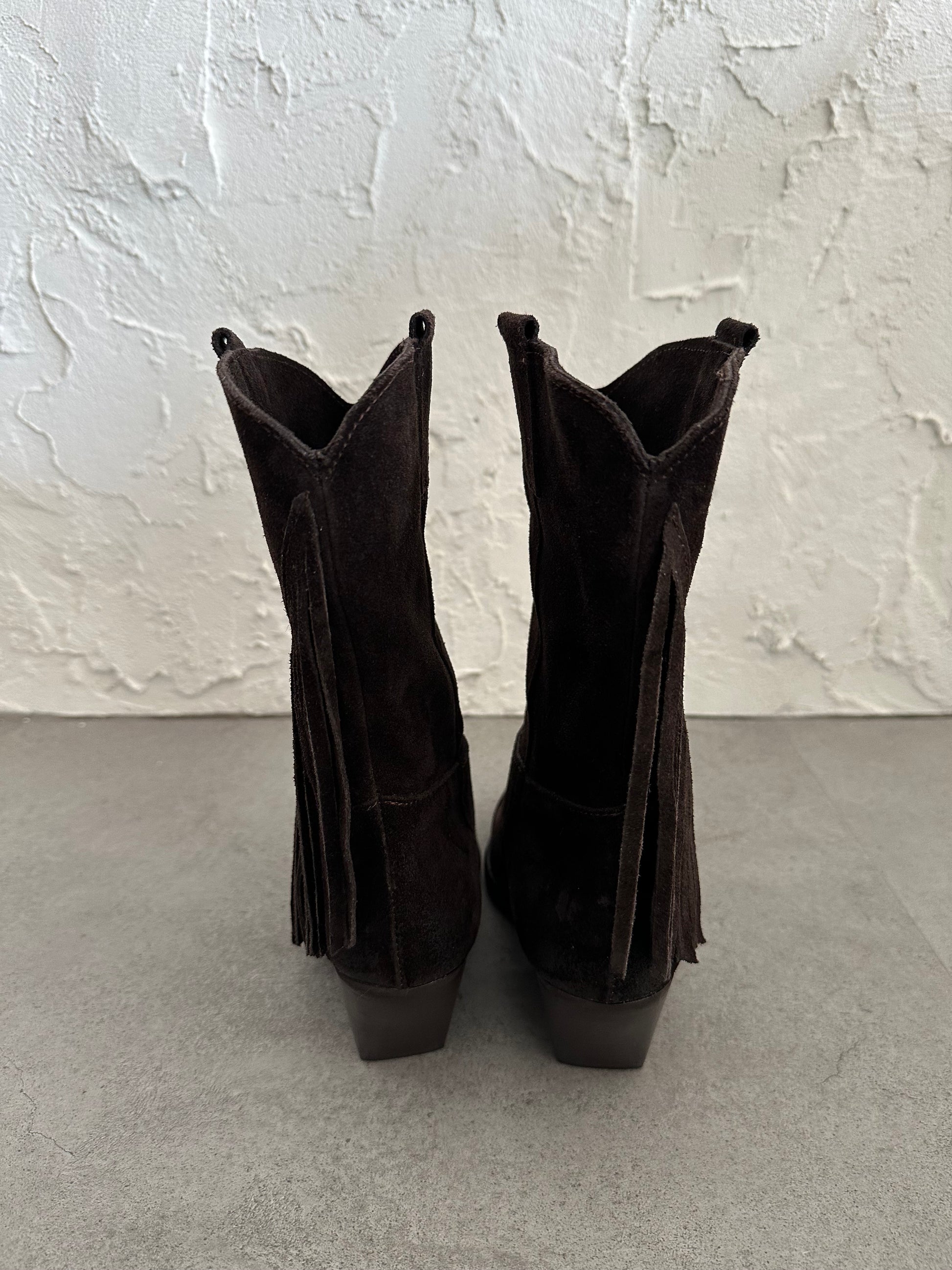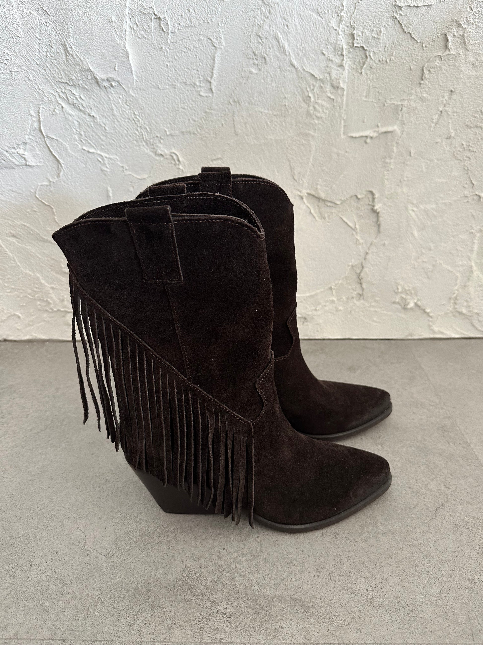 Texano in vero camoscio testa di moro con dettaglio frange, media altezza gambale, tacco 7 cm.